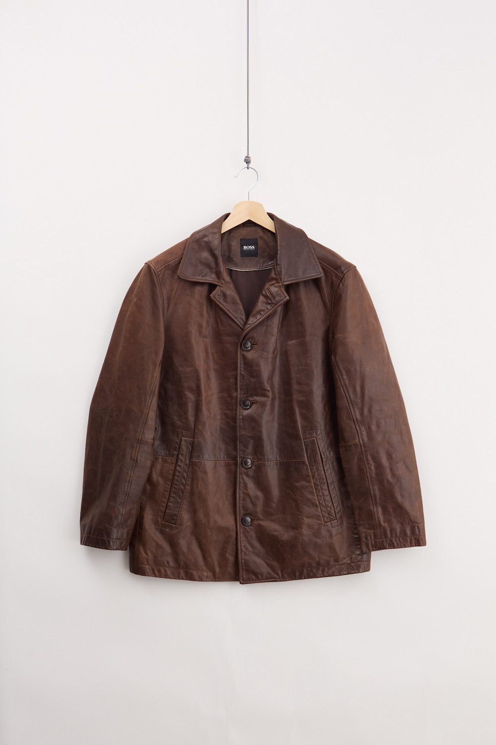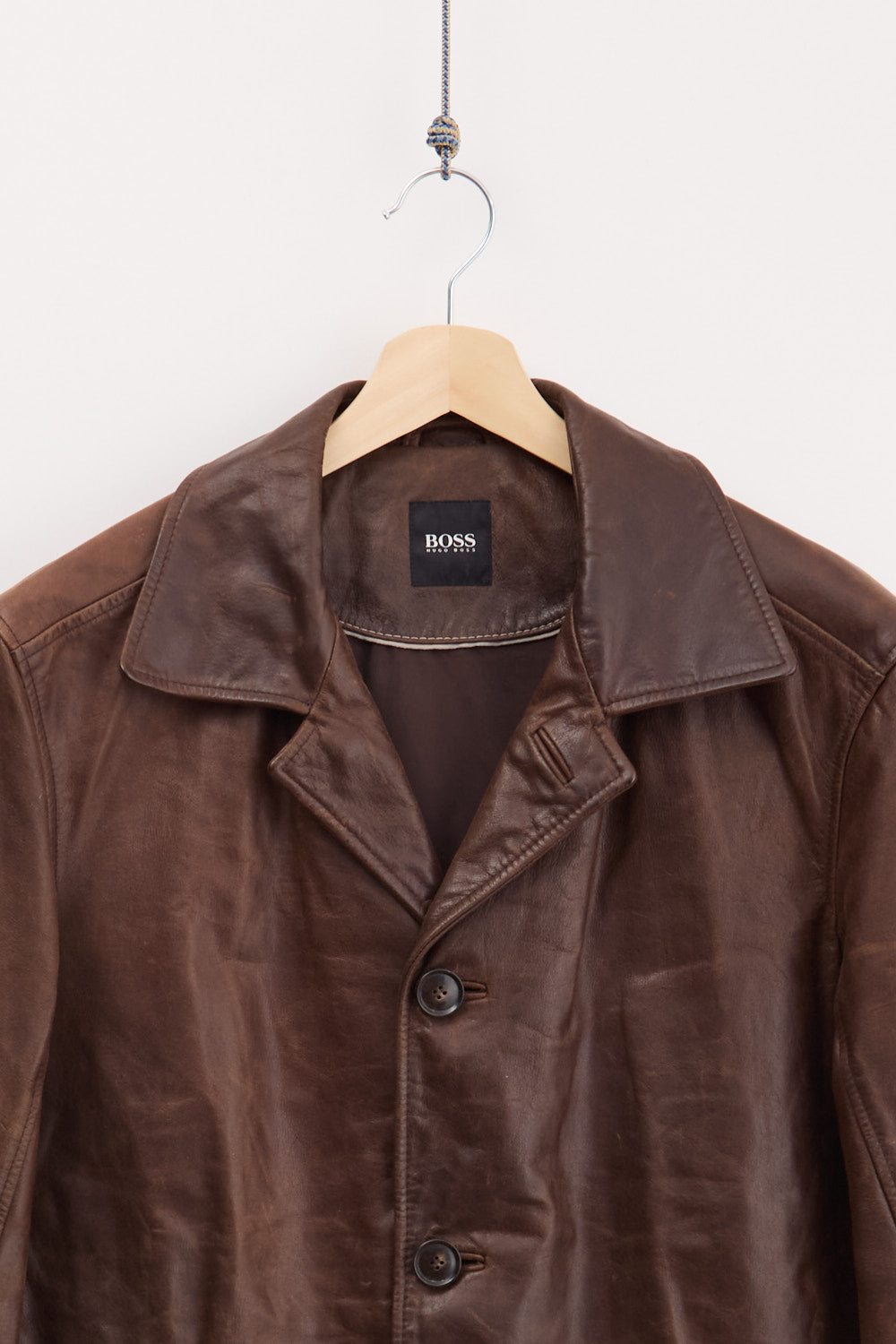 Beatiful patina on the soft leather. Features inside pockets. Made by Boss by Hugo Boss. Can fit both Medium or Large, so check measurements