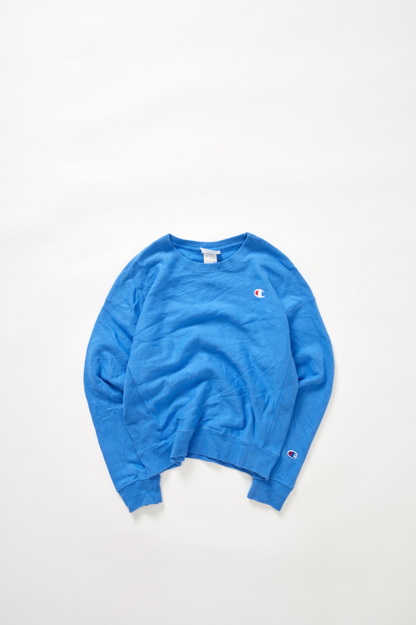 Classic Champion Reverse Weave crewneck sweater in a faded blue color. Embroidered Champion logo on the left chest. Tagged size M, fits XS-S.