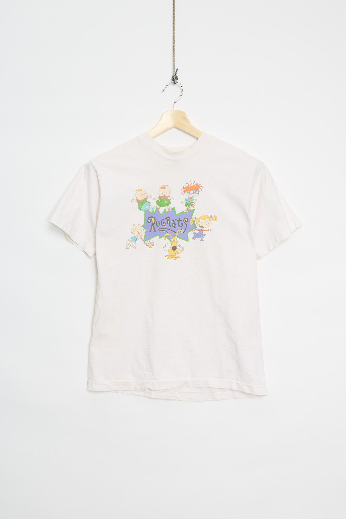 90's white tee with Rugrats print, perfectly faded. Printed on a Fruit of the Loom tee. Some tiny moth holes.