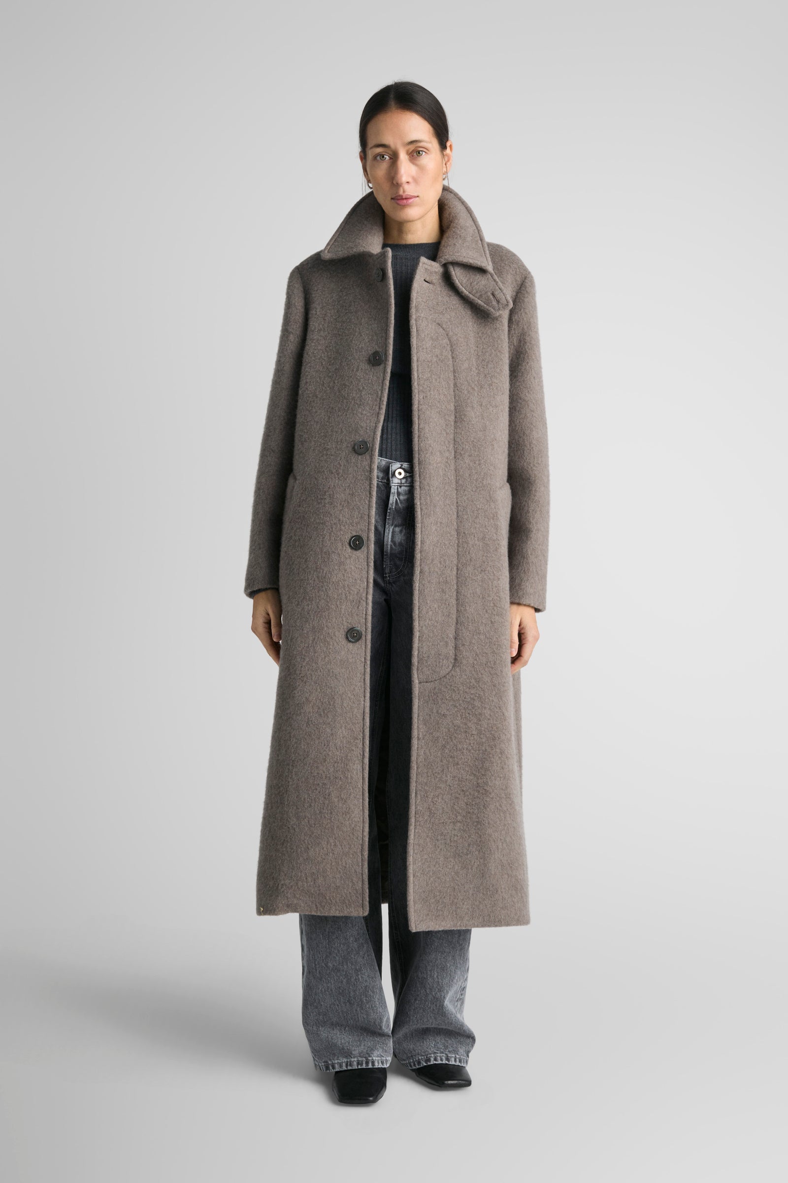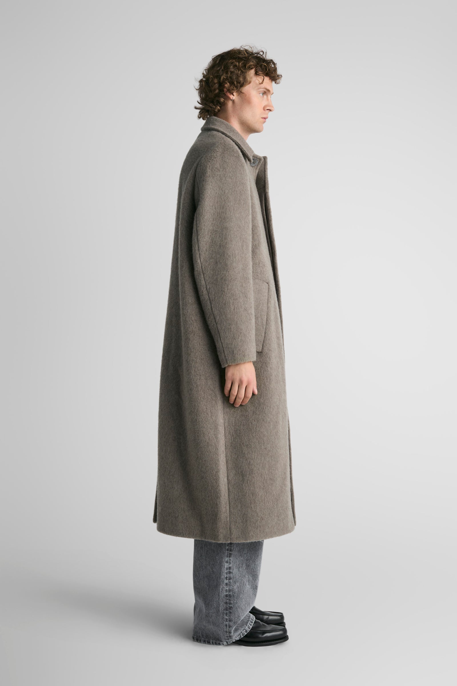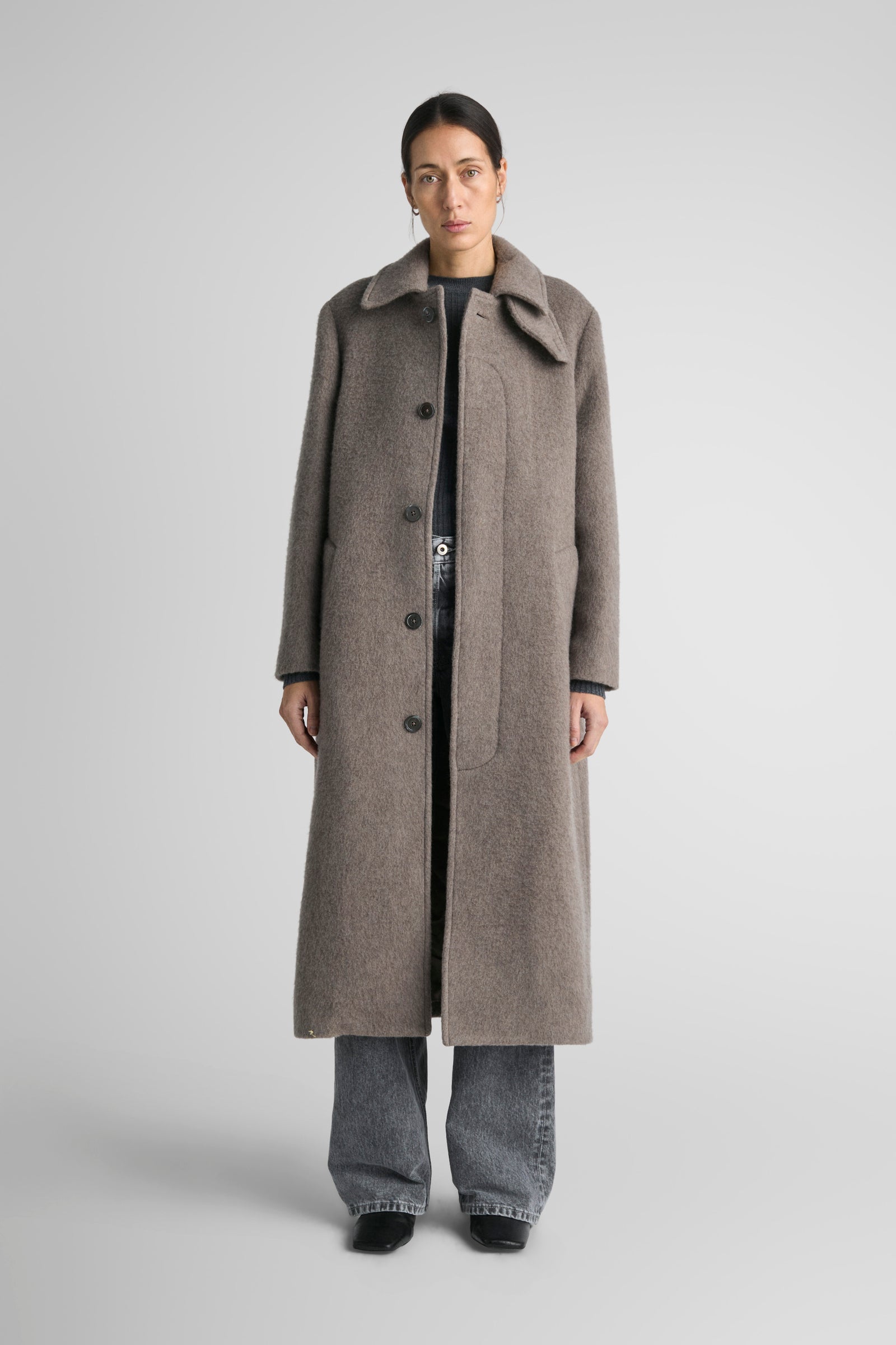 Full length, featuring a wide collar, and hidden mother of pearl buttons down the front. A wide silhouette that has room for heavy layering, or a full suit, while still feeling relaxed and unconstricting. Inner pocket at the chest, and hand warmer pockets at the hips.