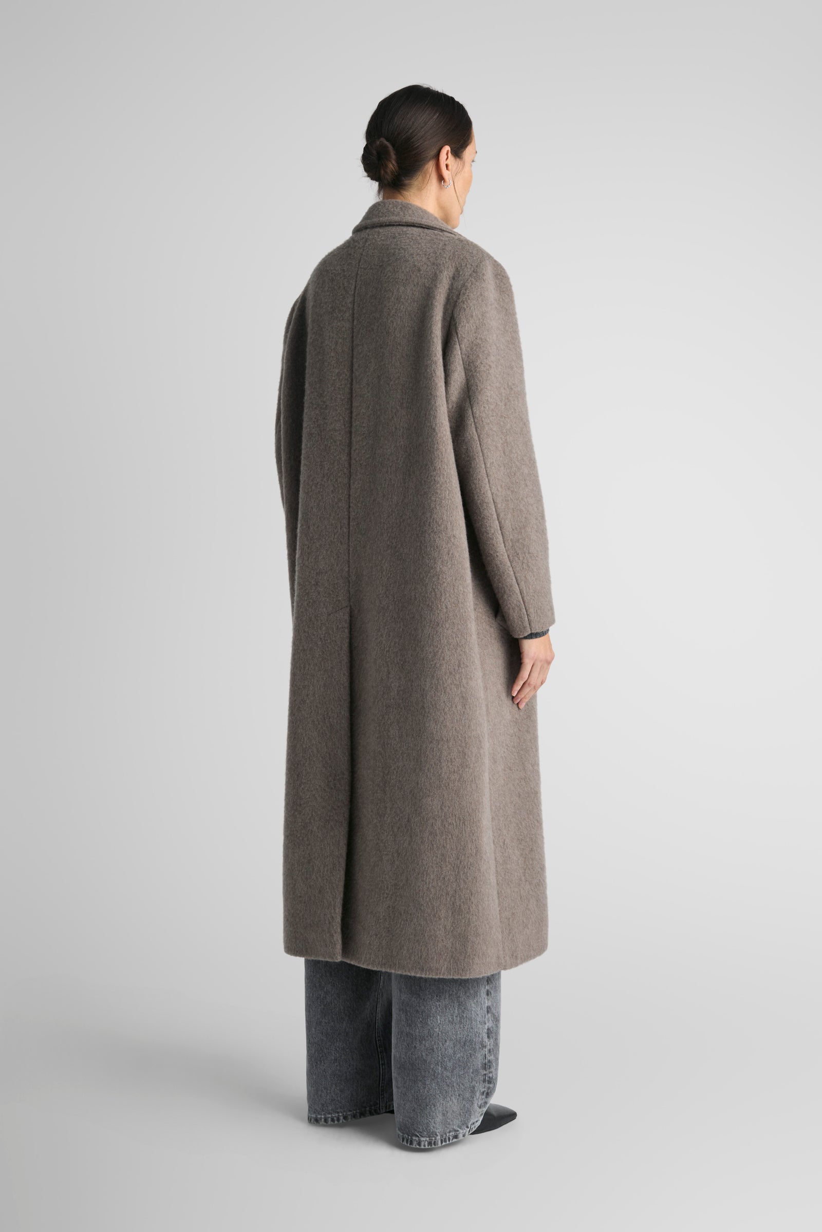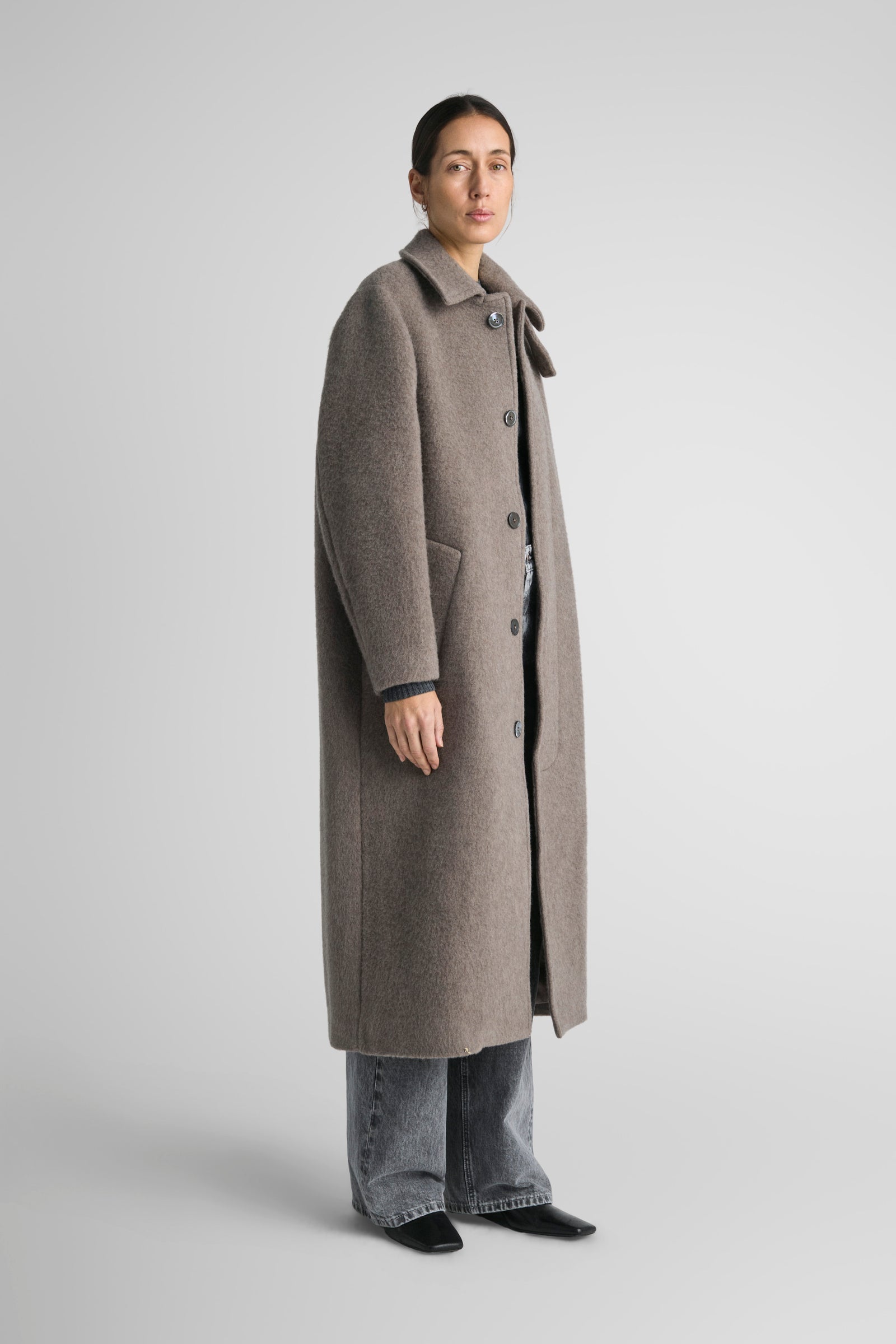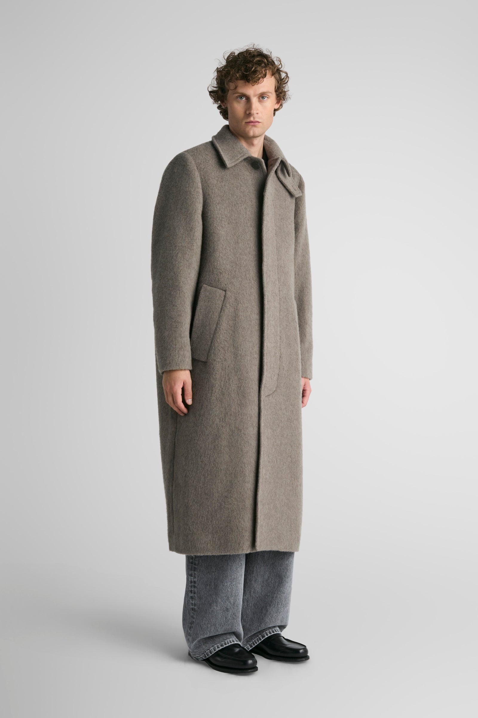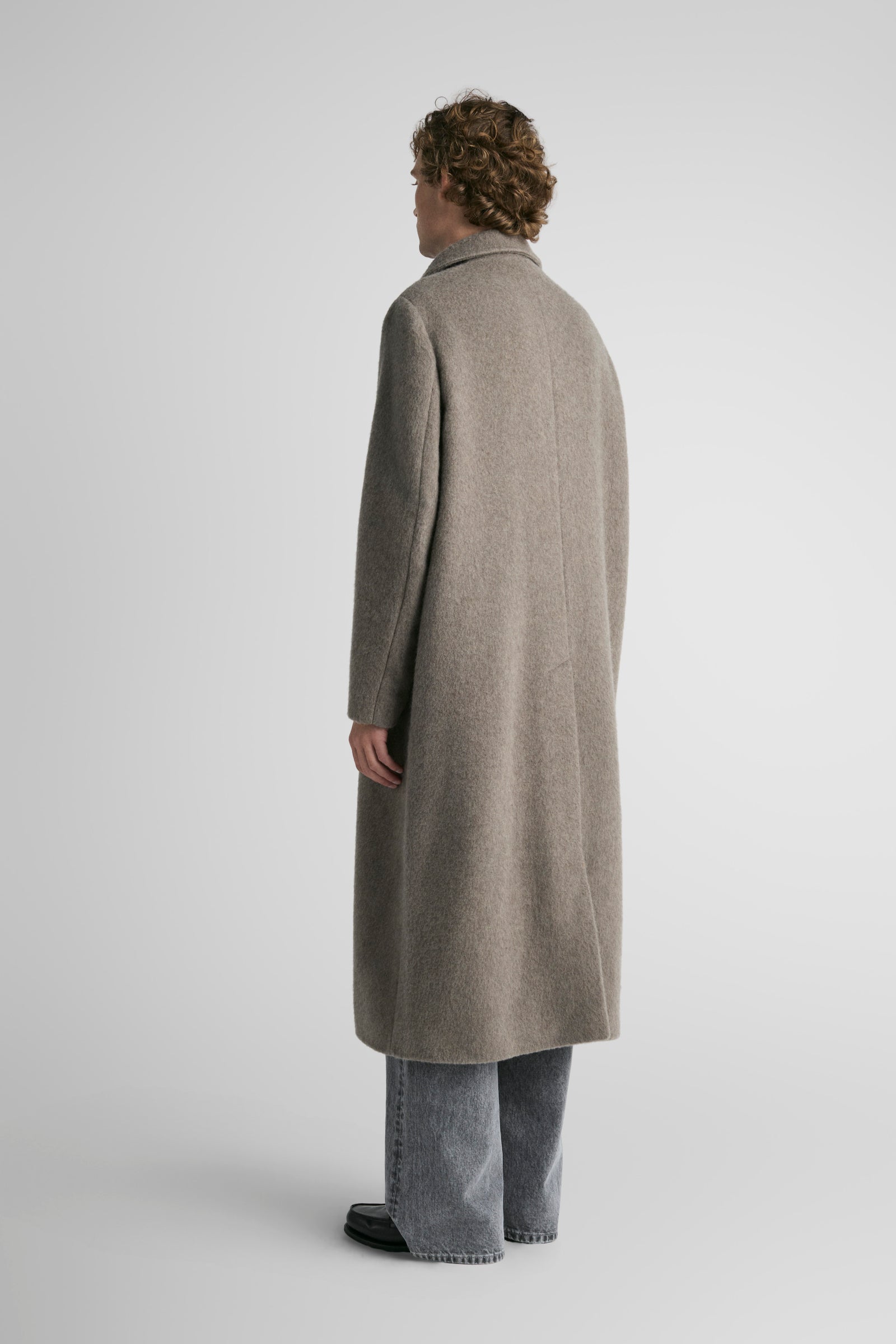Full length, featuring a wide collar, and hidden mother of pearl buttons down the front. A wide silhouette that has room for heavy layering, or a full suit, while still feeling relaxed and unconstricting. Inner pocket at the chest, and hand warmer pockets at the hips.
