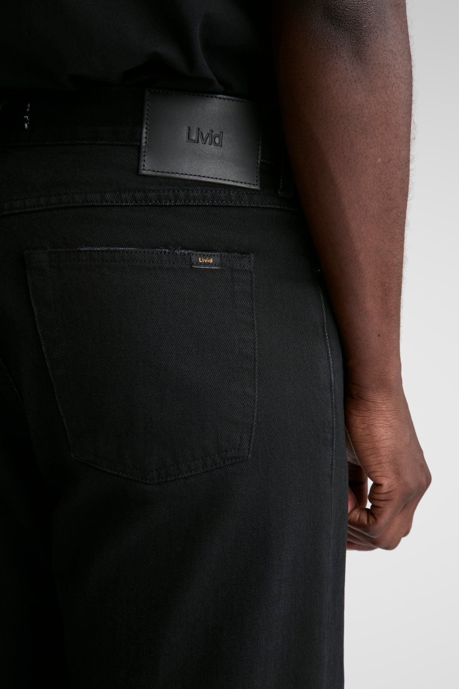 In our slightly broken-in Japan Black Dusk wash. Made in a solid 13 Oz 100% cotton denim from the renowned Japanese denim mill Kuroki. Soft to the touch, the Japan Black Dusk is deep black with subtle fading at the the seams.