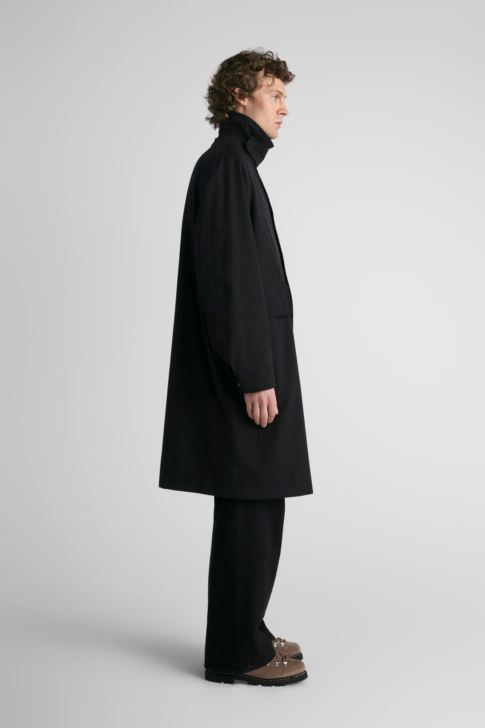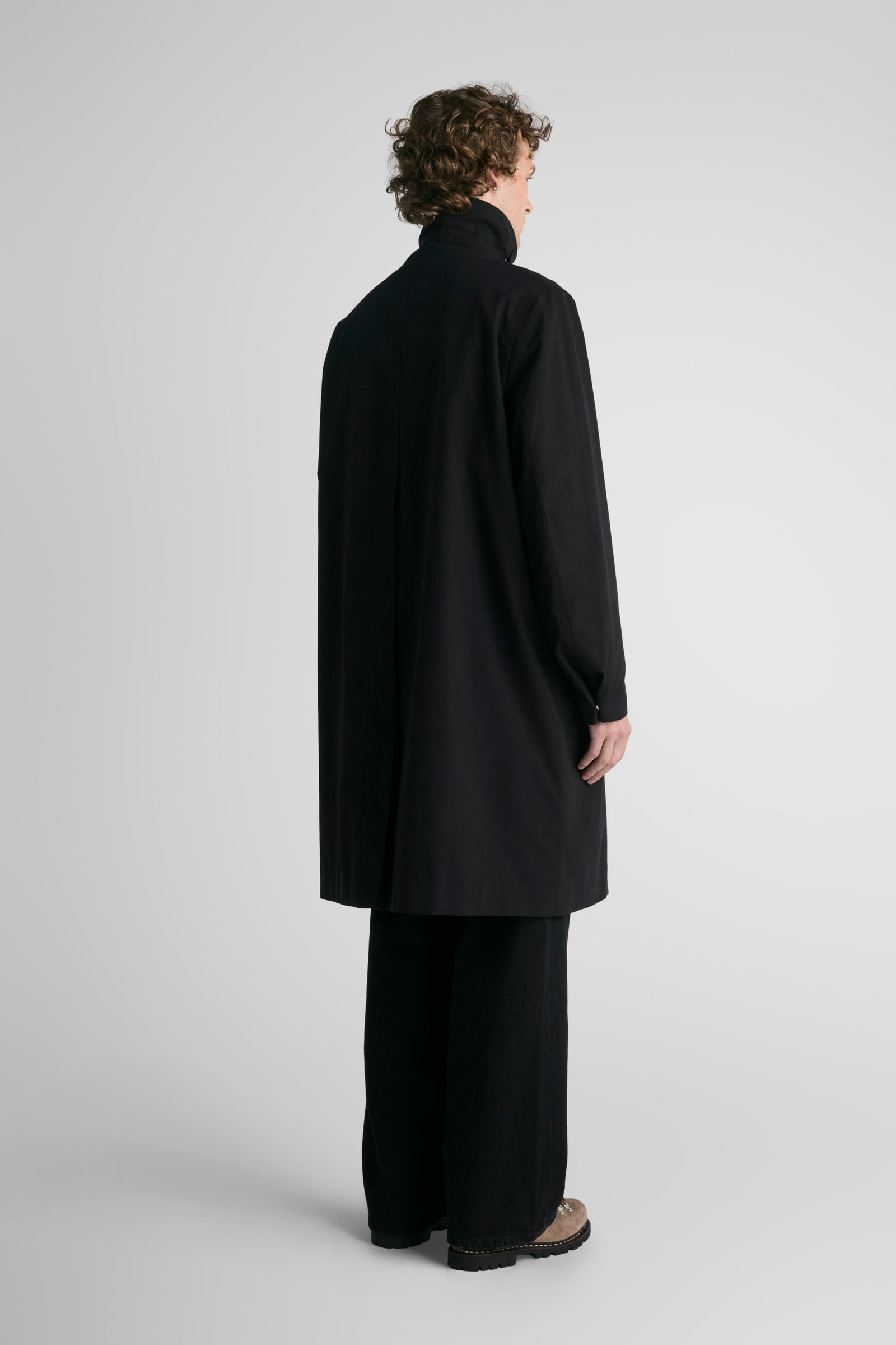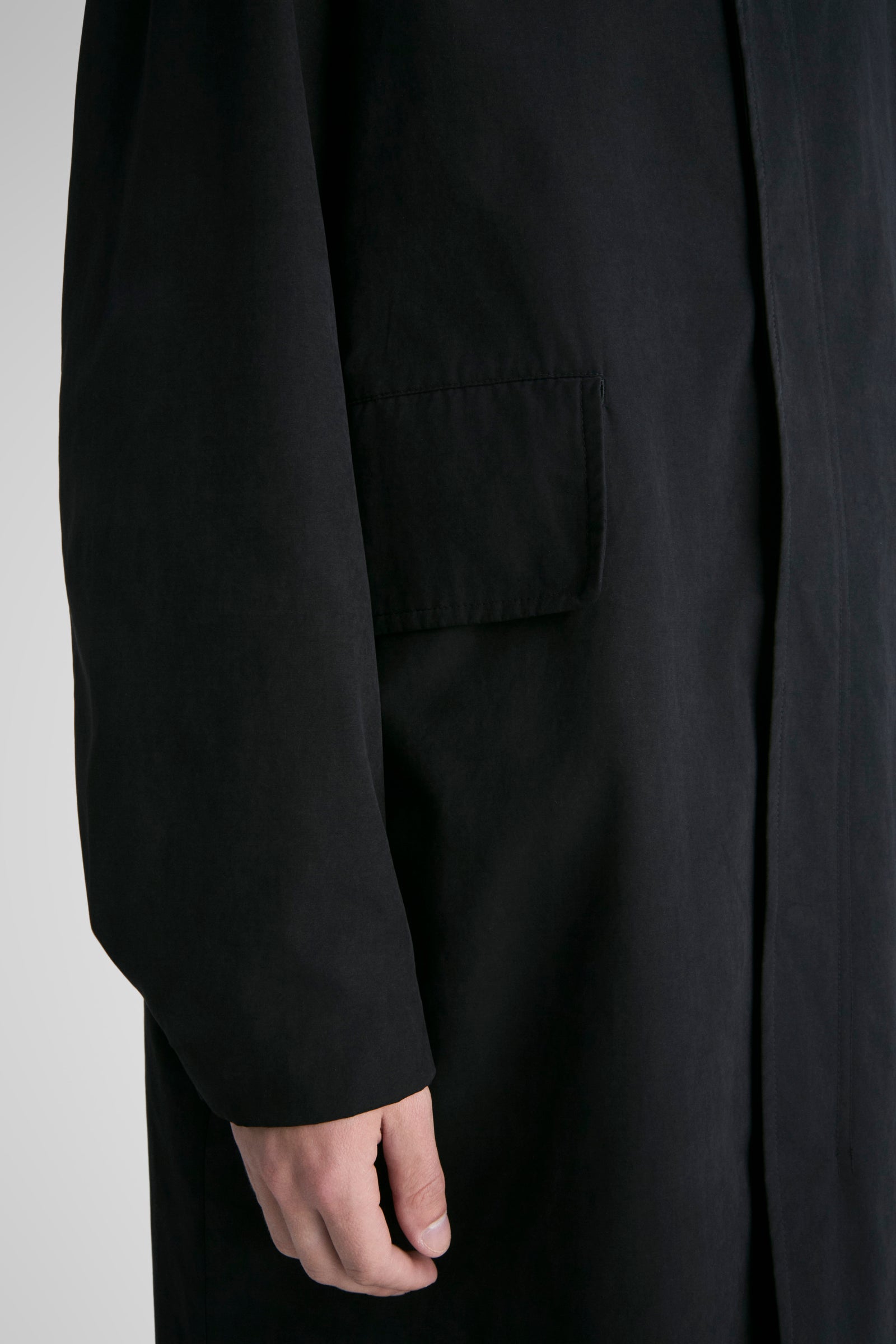 The bold silhouette is finished with a wide collar, a detachable throat latch, and two large flap pockets at the waist. Two-way full length zipper closure, covered by a flap secured with Riri snap buttons.