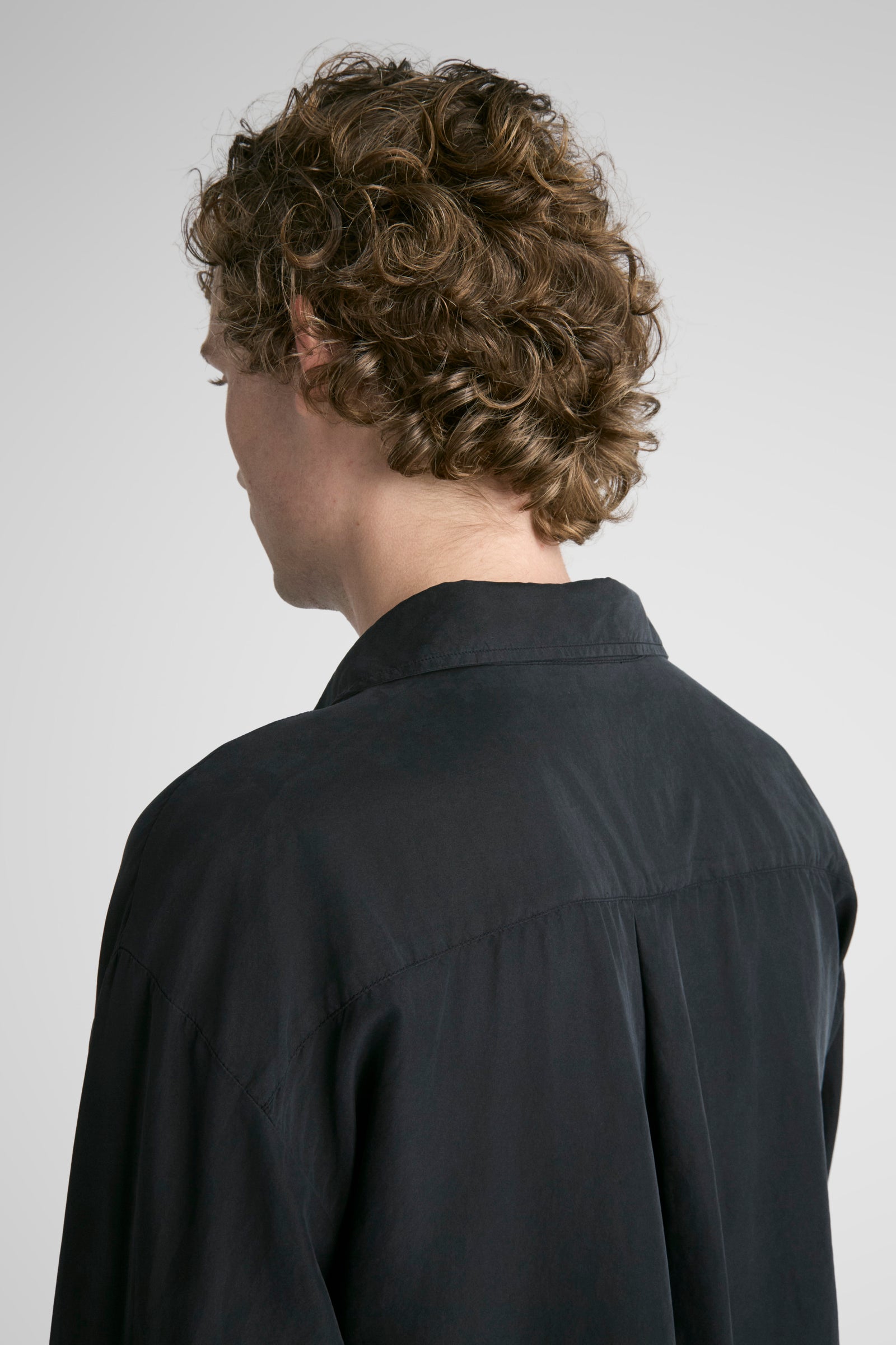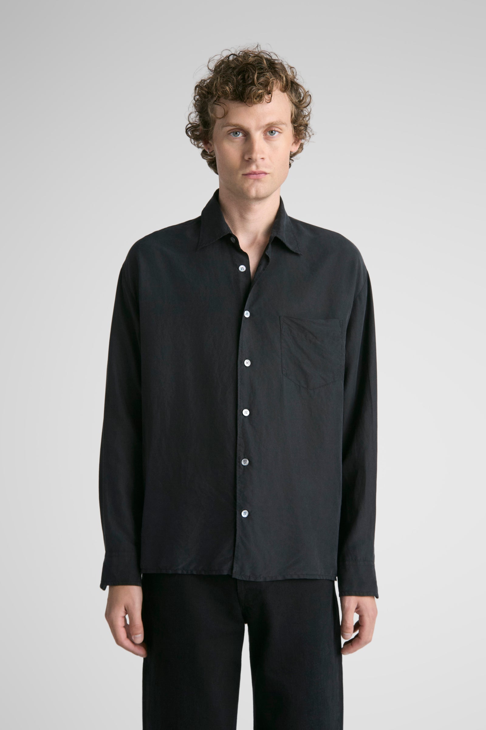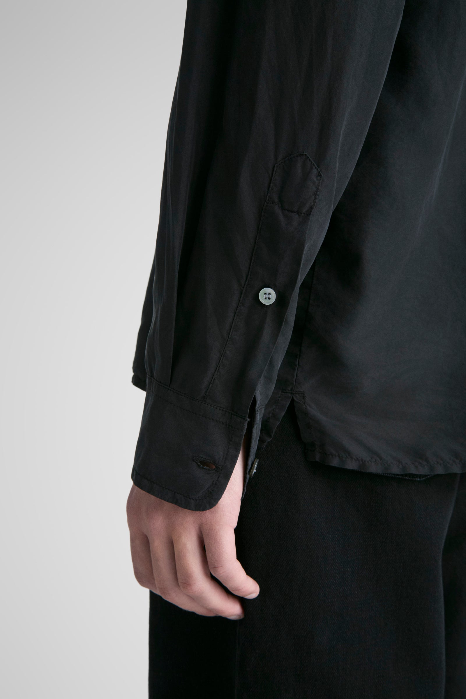 Garment dyed, giving the silk fabric a deep black, but softer colour than a yarn dye. Designed with a generous straight cut and intended for normal layering. Featuring a box pleat at the back yoke, and a french placket with natural Mother of Pearl buttons.