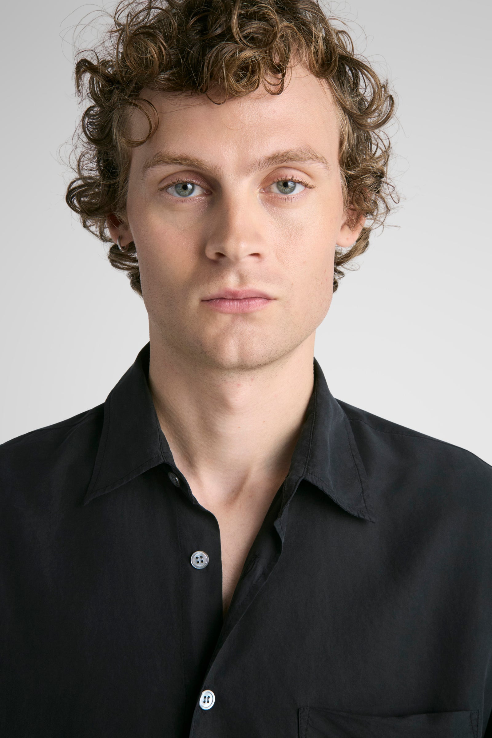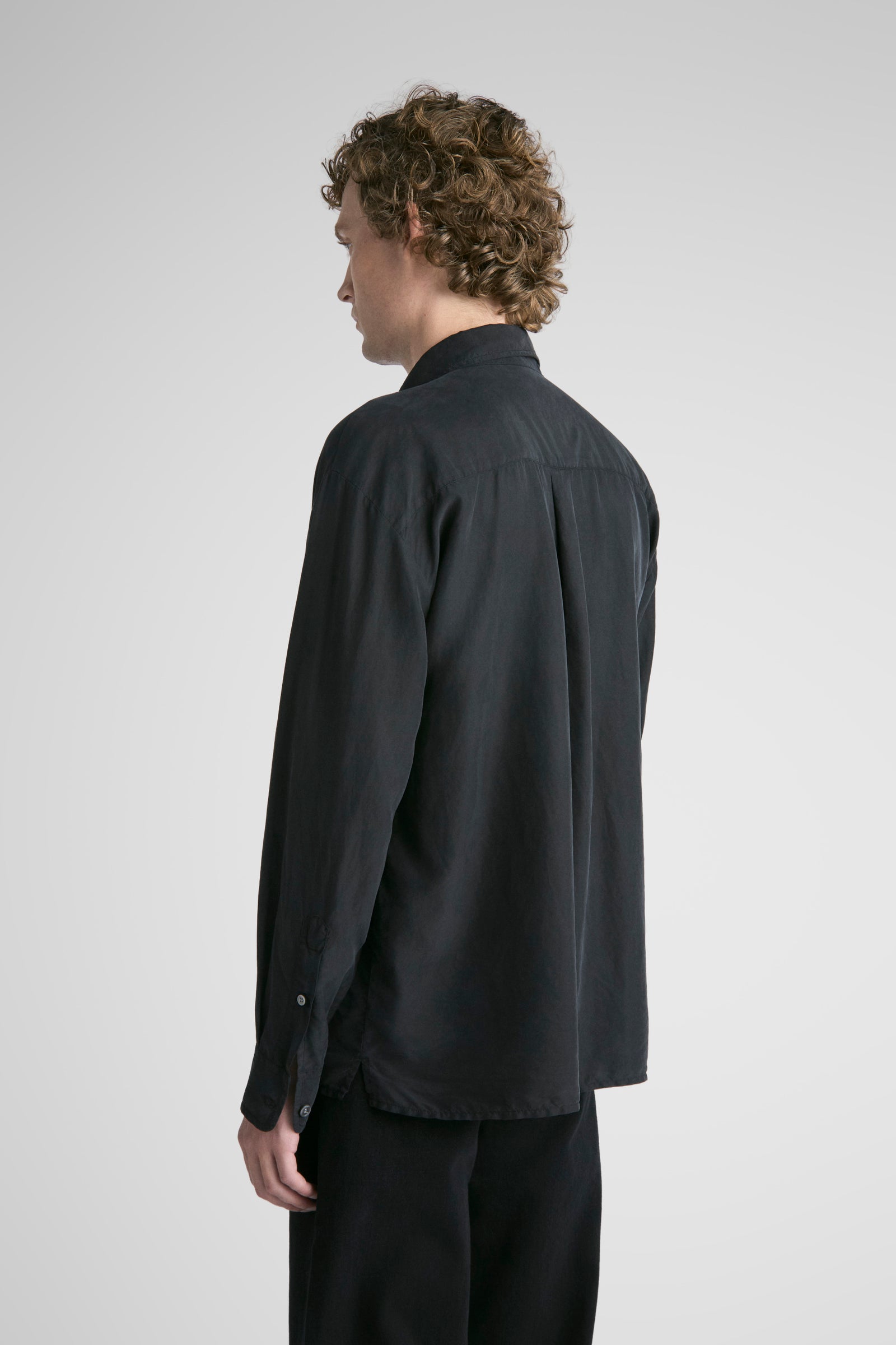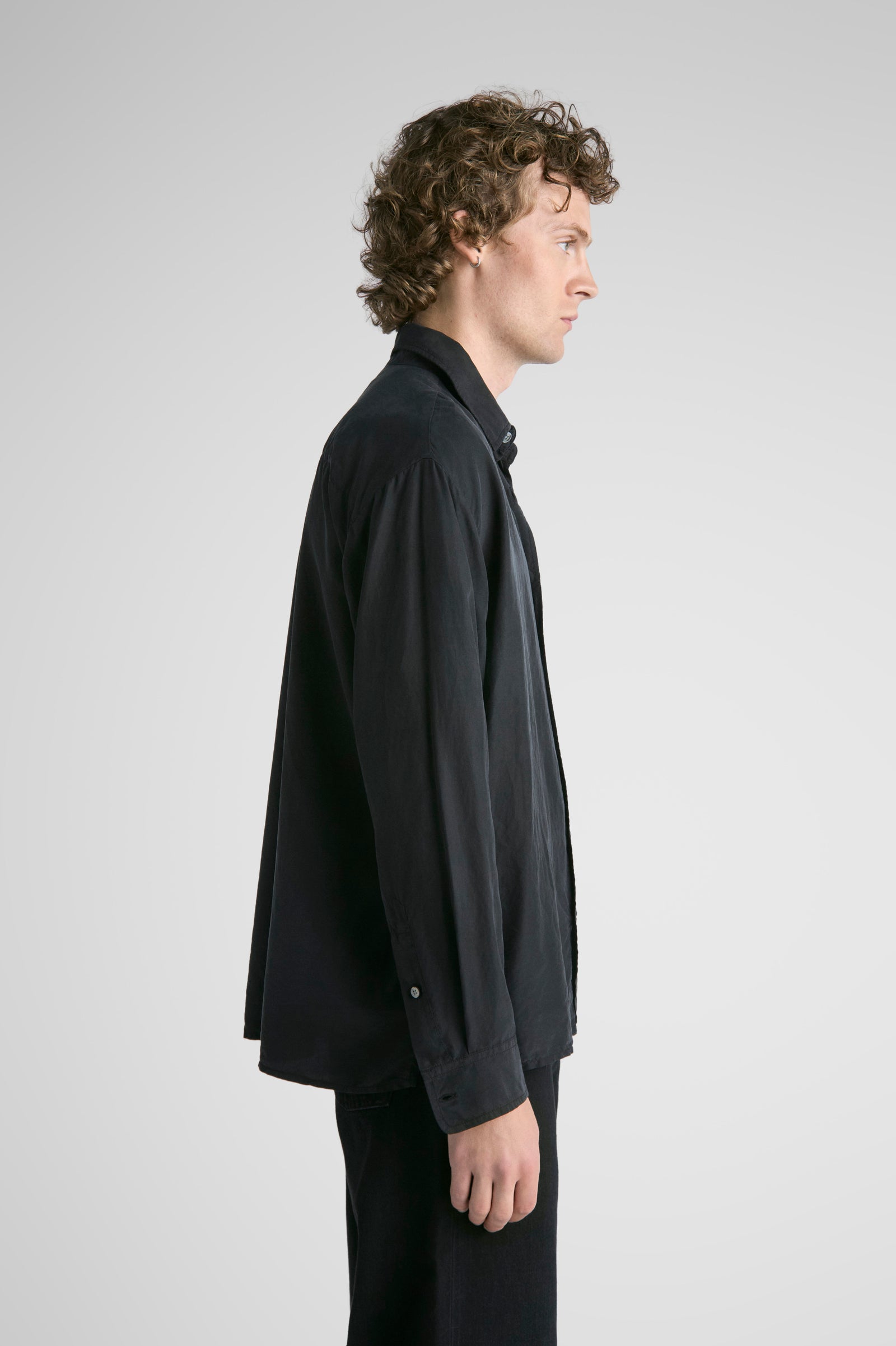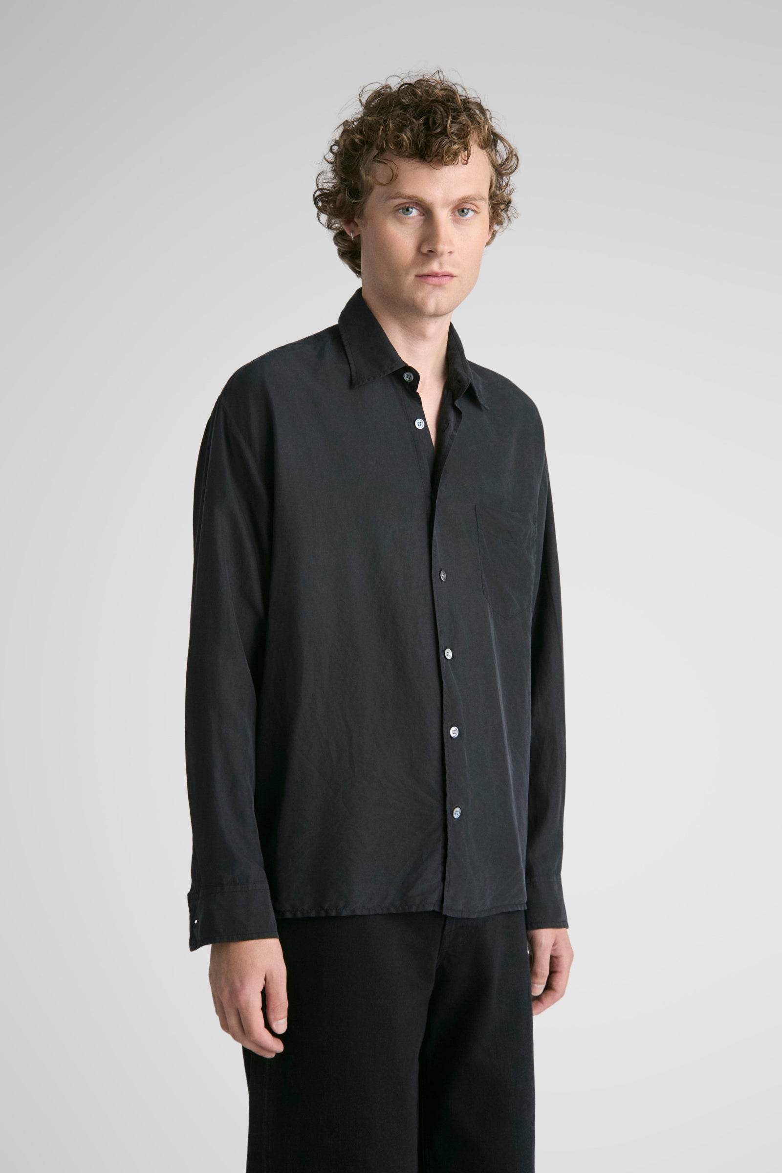 Garment dyed, giving the silk fabric a deep black, but softer colour than a yarn dye. Designed with a generous straight cut and intended for normal layering. Featuring a box pleat at the back yoke, and a french placket with natural Mother of Pearl buttons.