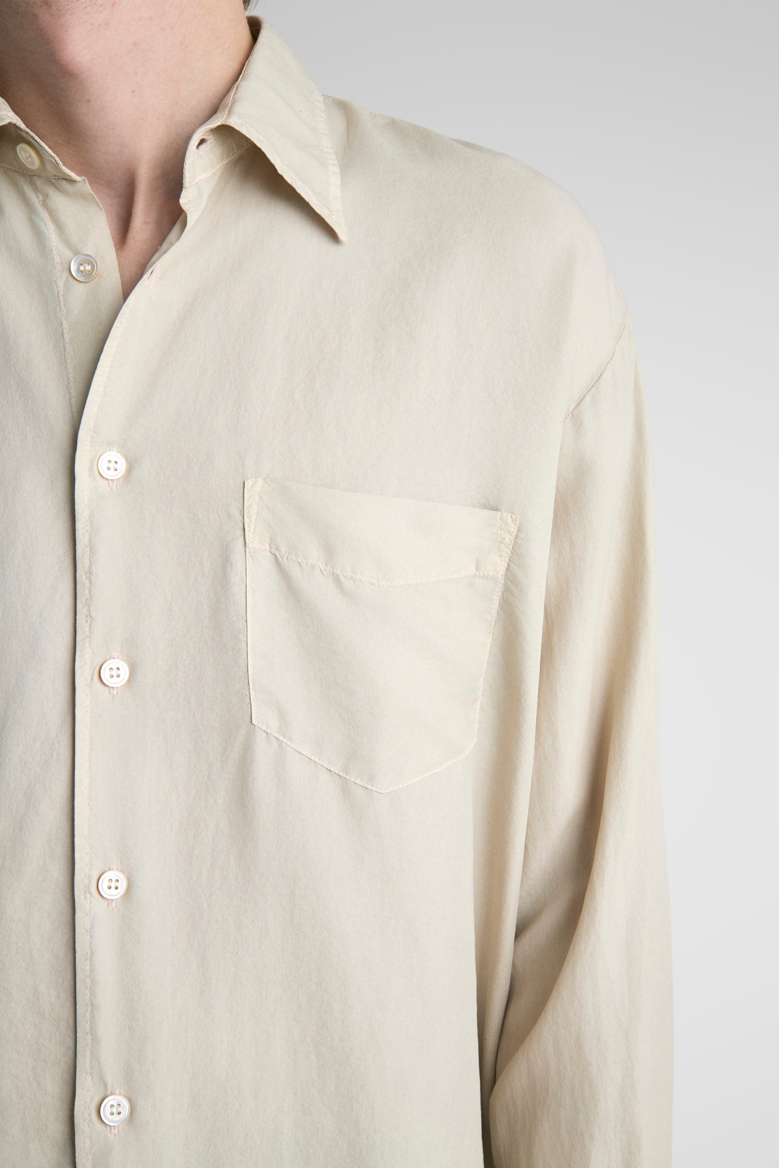 Garment dyed and washed down, giving the silk fabric a softer colour with a subtle variation and depth. Designed with a generous straight cut and intended for normal layering. Featuring a box pleat at the back yoke, and a french placket with natural Mother of Pearl buttons.