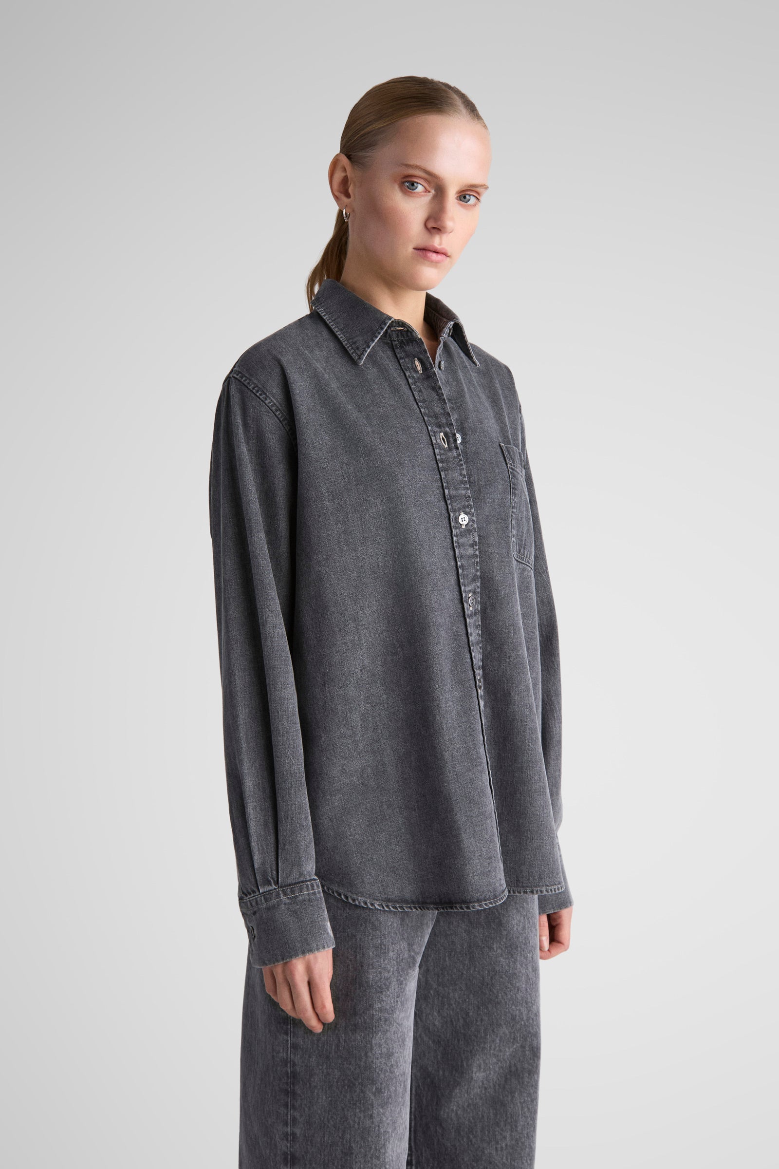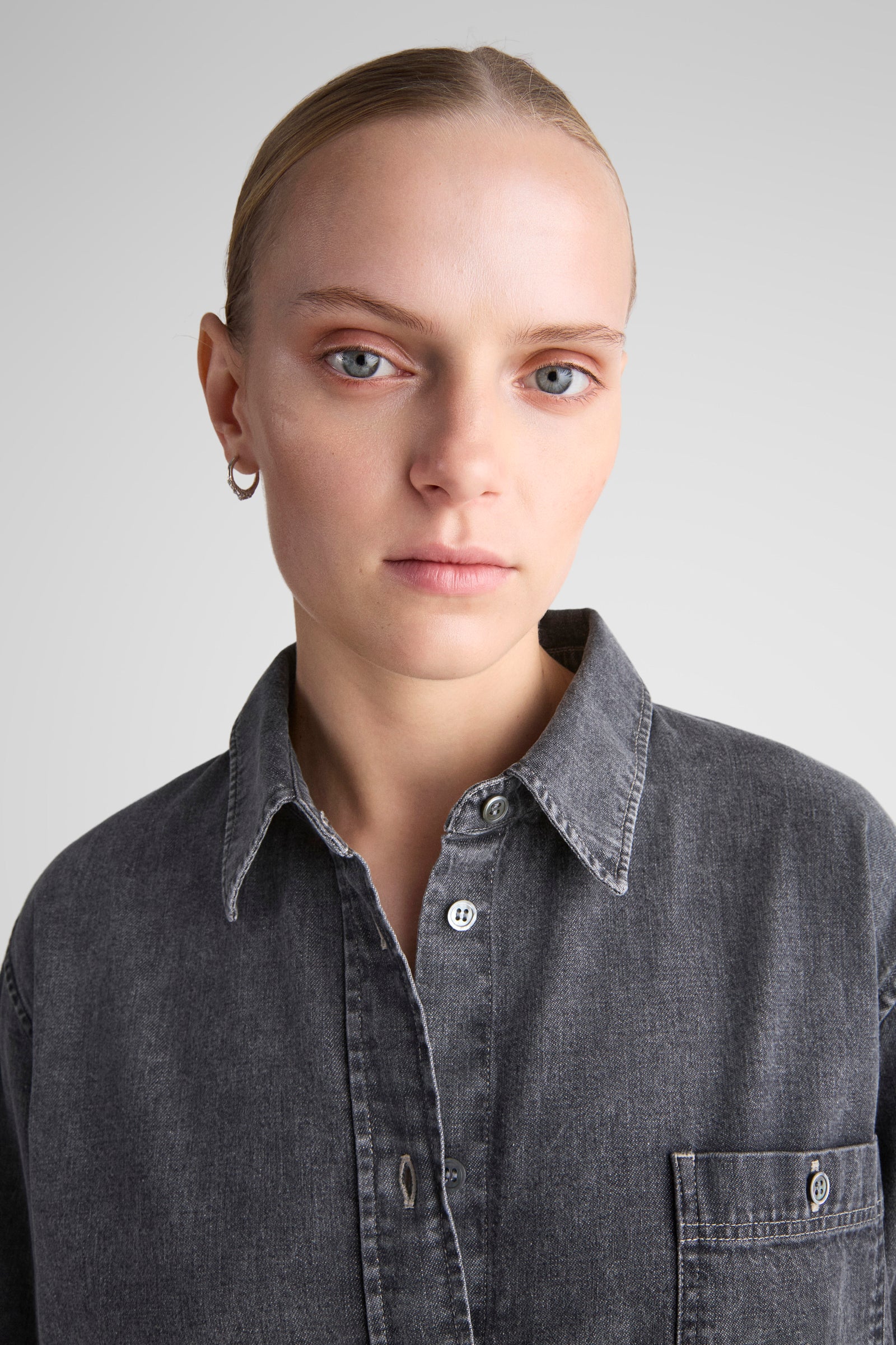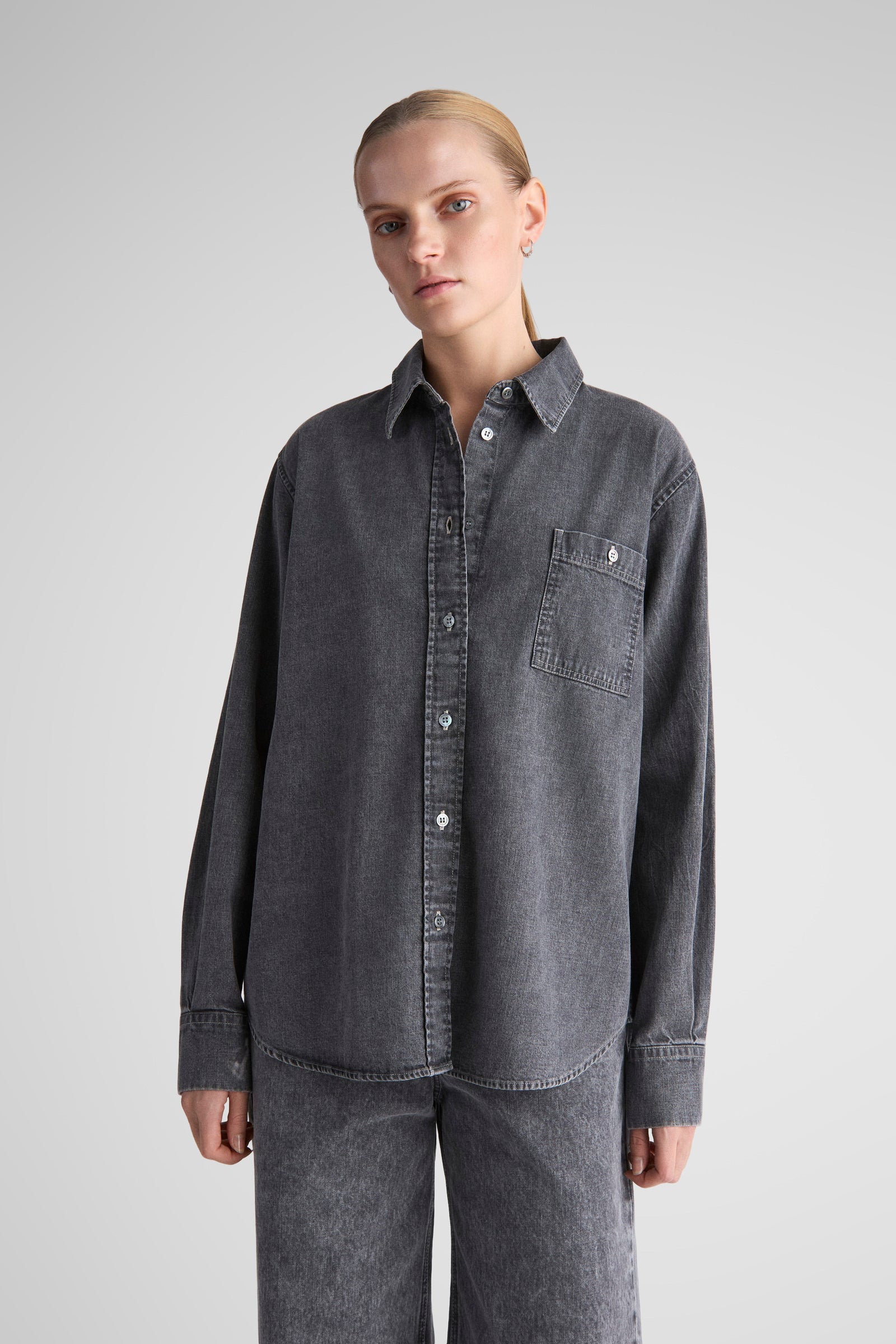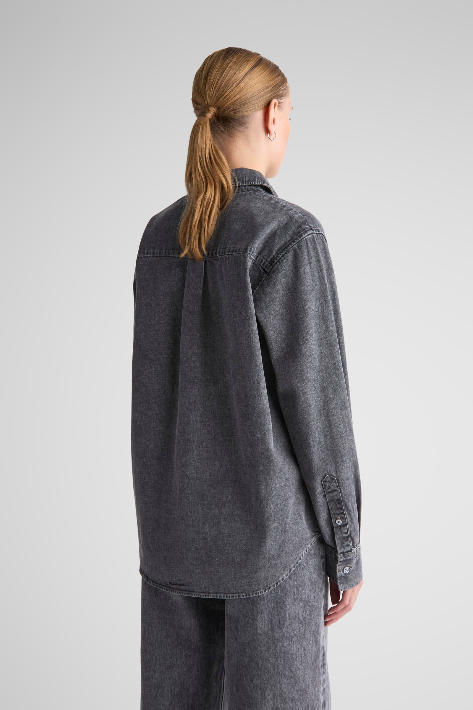 Maiko, our regular fit denim shirt, Henrey. Made with slightly dropped shoulders, a regular relaxed body, softly curved hems, a single square chest pocket and a center box pleat at the back yoke.
