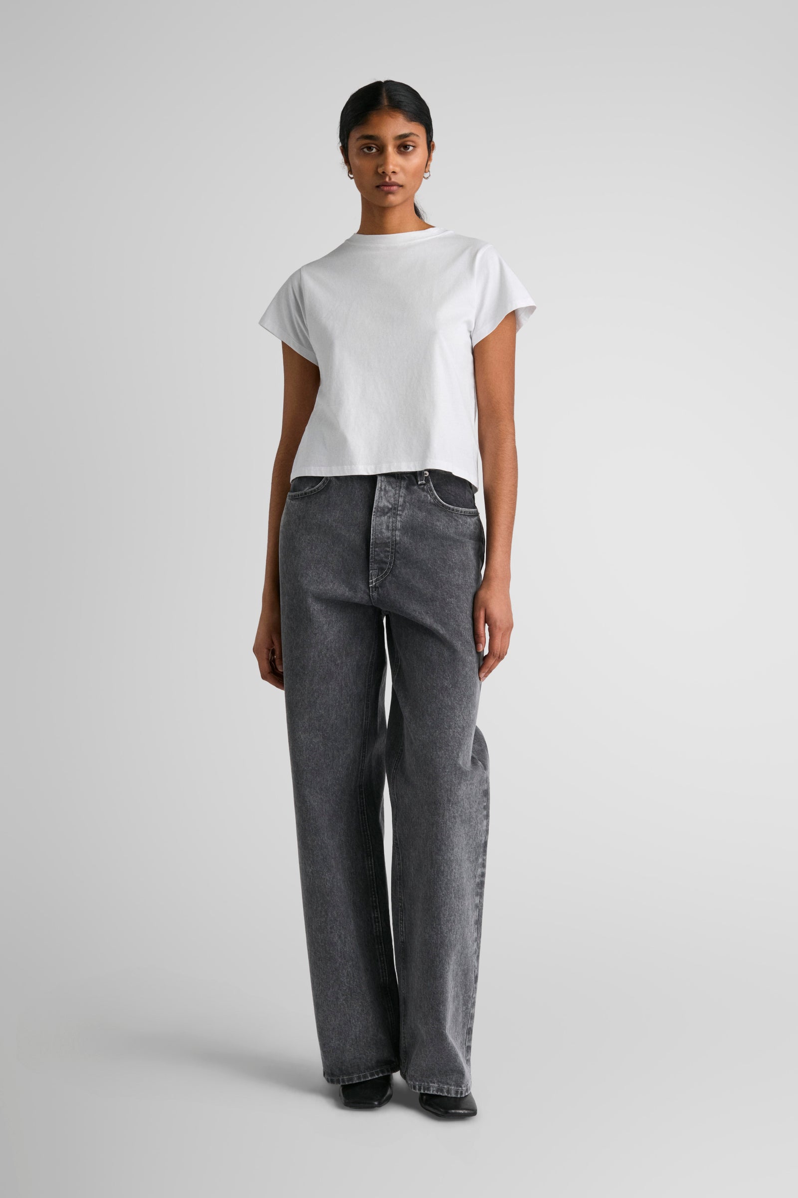 Mila features dropped shoulders and a wide body, with a straight hem that ends at the hip.