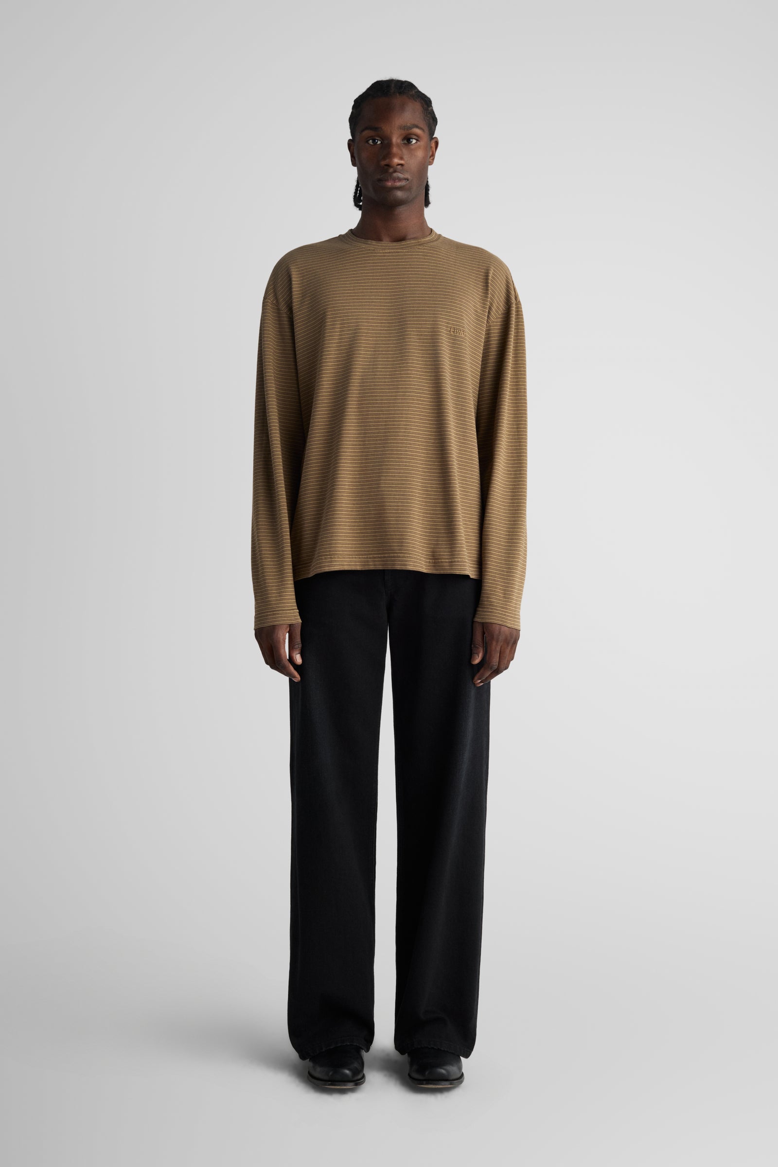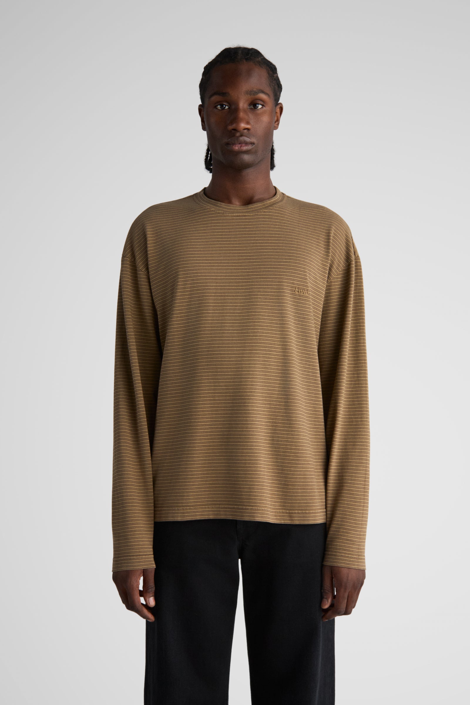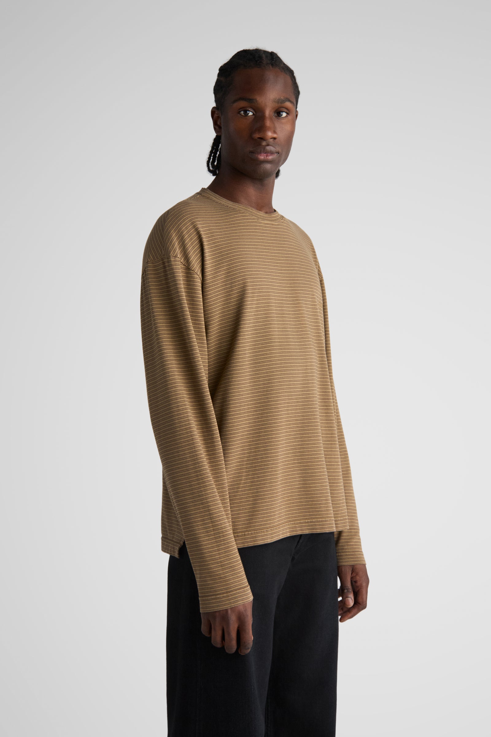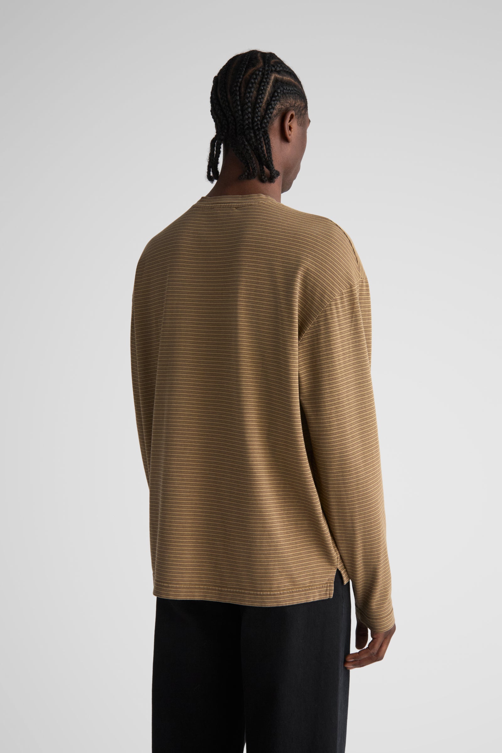 Needle, our relaxed longsleeve, made with dropped shoulders, a relaxed body, slits at the bottom hem, and a slightly longer back. Made in our signature 6.5 Oz. jersey. Knitted in a stripe design, and then overdyed.