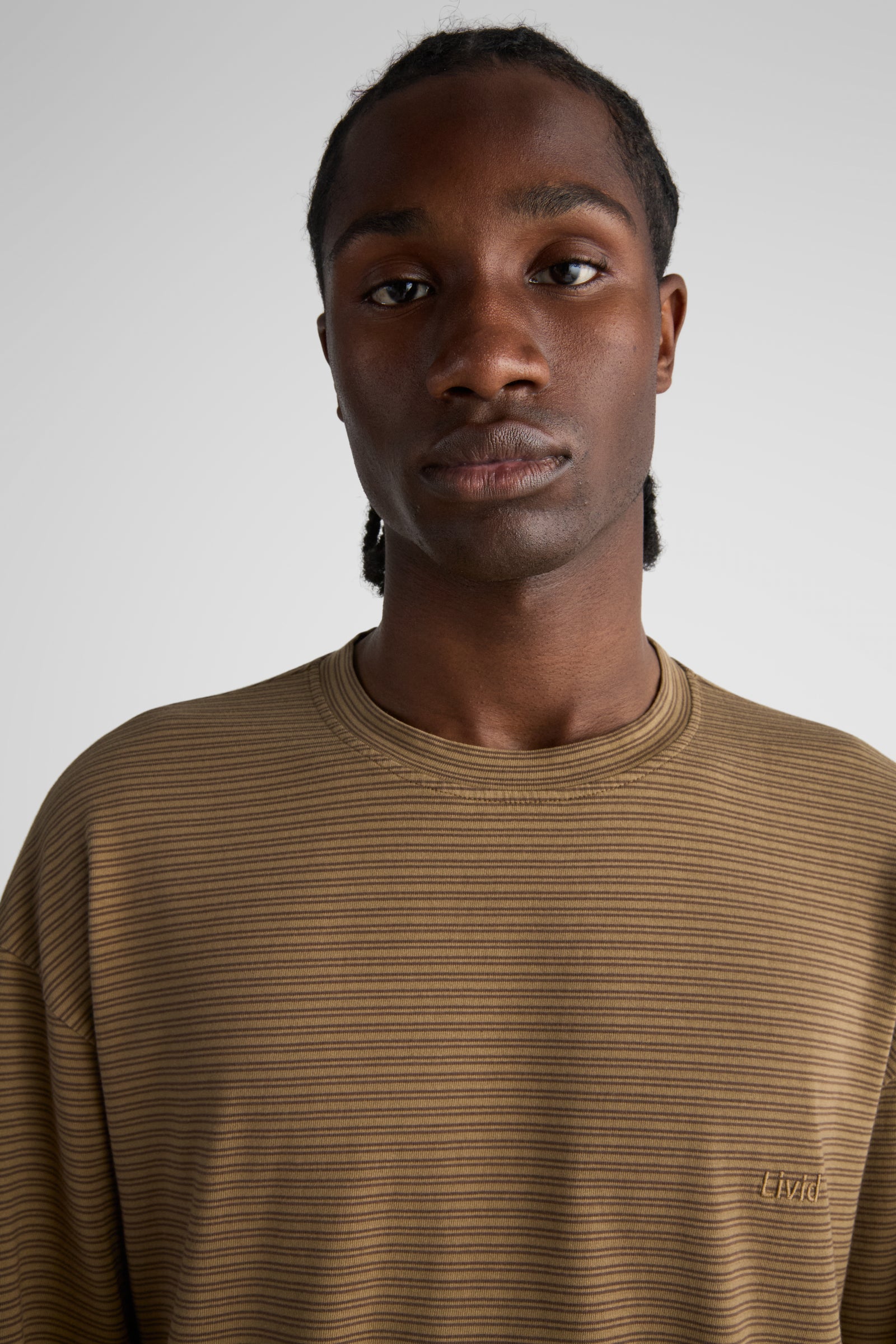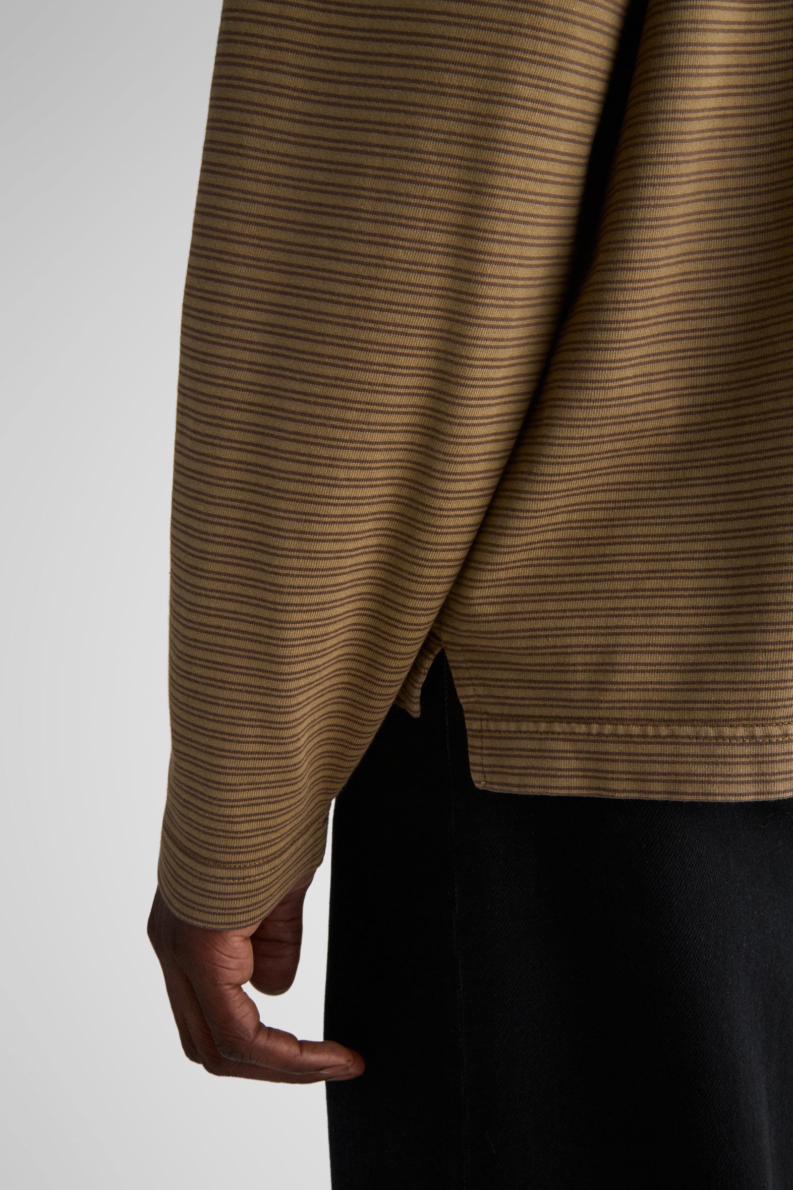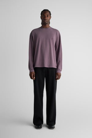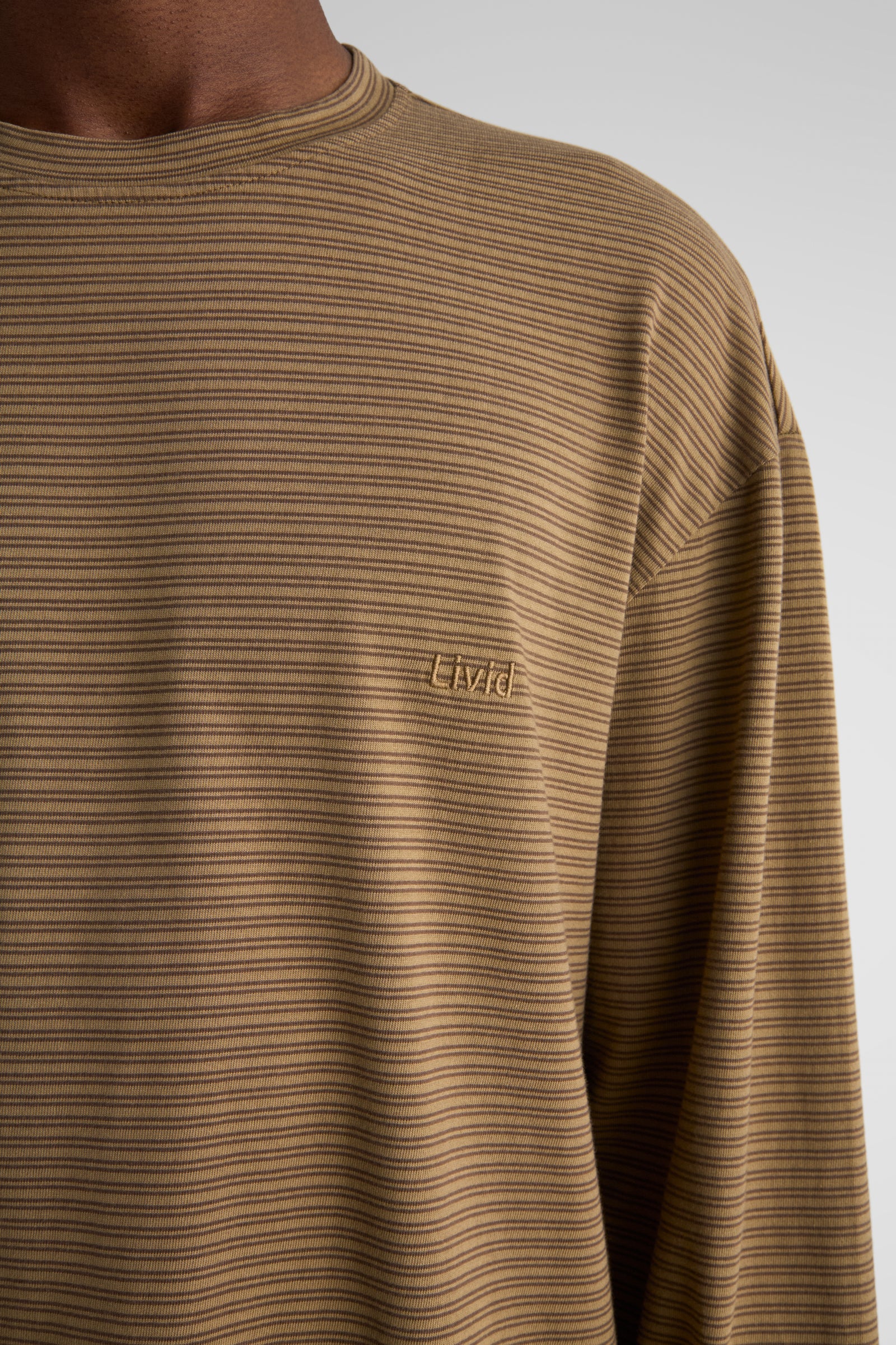 Needle, our relaxed longsleeve, made with dropped shoulders, a relaxed body, slits at the bottom hem, and a slightly longer back. Made in our signature 6.5 Oz. jersey. Knitted in a stripe design, and then overdyed.