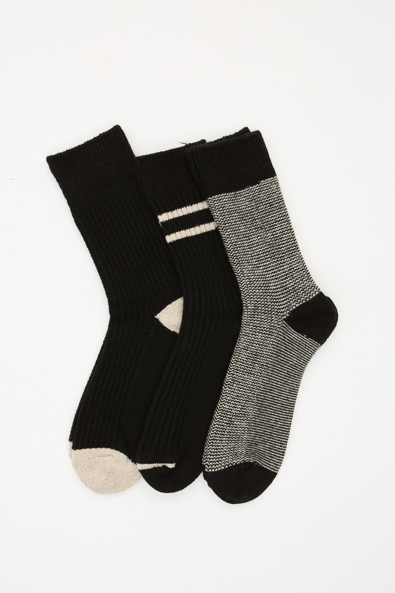 Perfect 3 pack of socks, knitted in three different heritage styles. Made in a warming blend of recycled cotton and wool for all day comfort, spun around a nylon core for durability. Expertly knitted in Japan on traditional machinery.