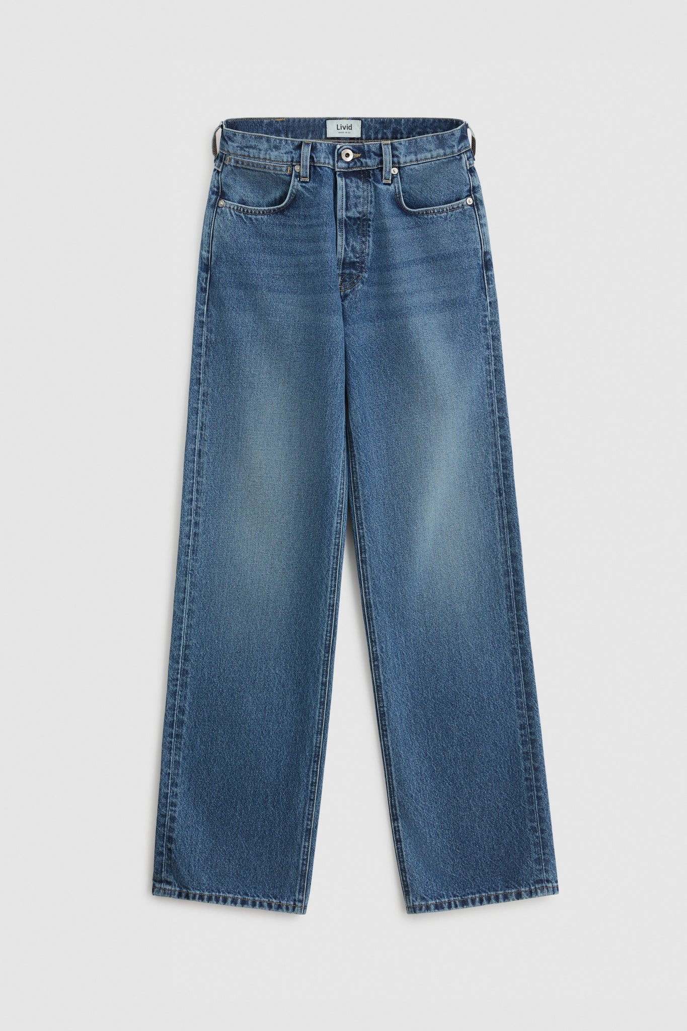 In our faded mid-blue wash, Japan Era. Made with a 13 Oz. 100% cotton, indigo wideloom denim woven by the renowned Japanese denim mill, Kuroki. Washed to a soft shade of indigo with subtle wear patterns for a classic vintage look.
