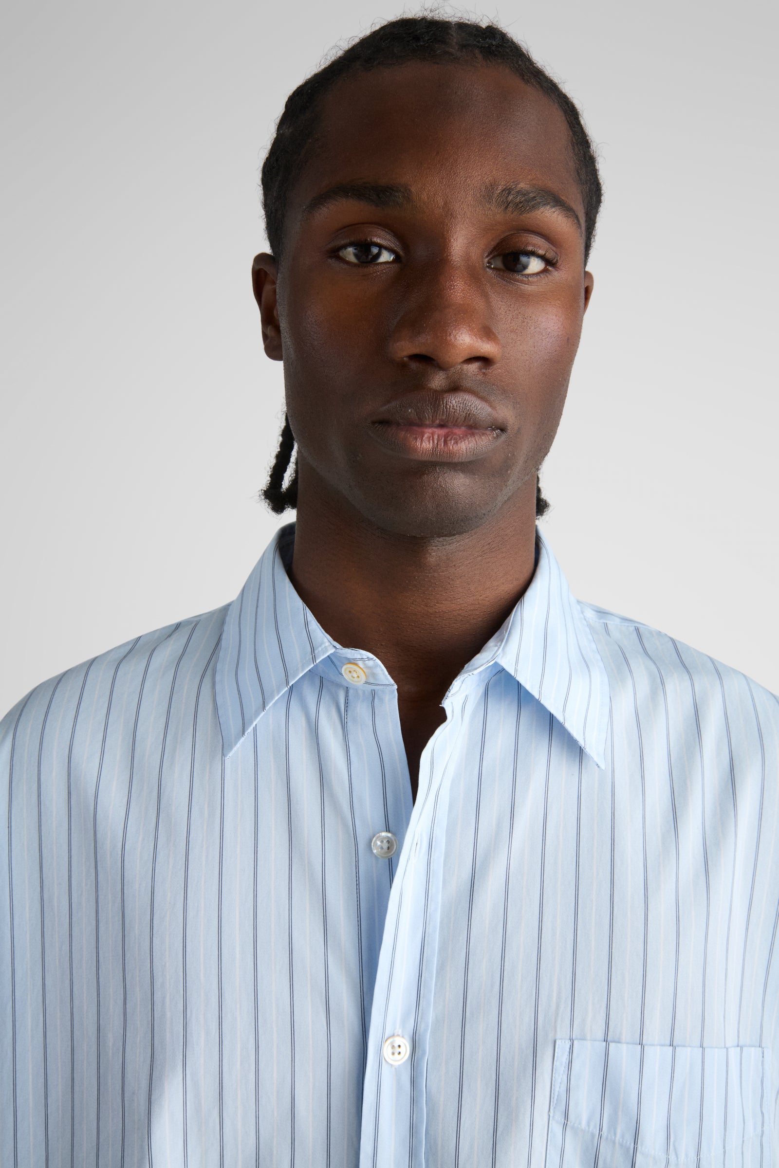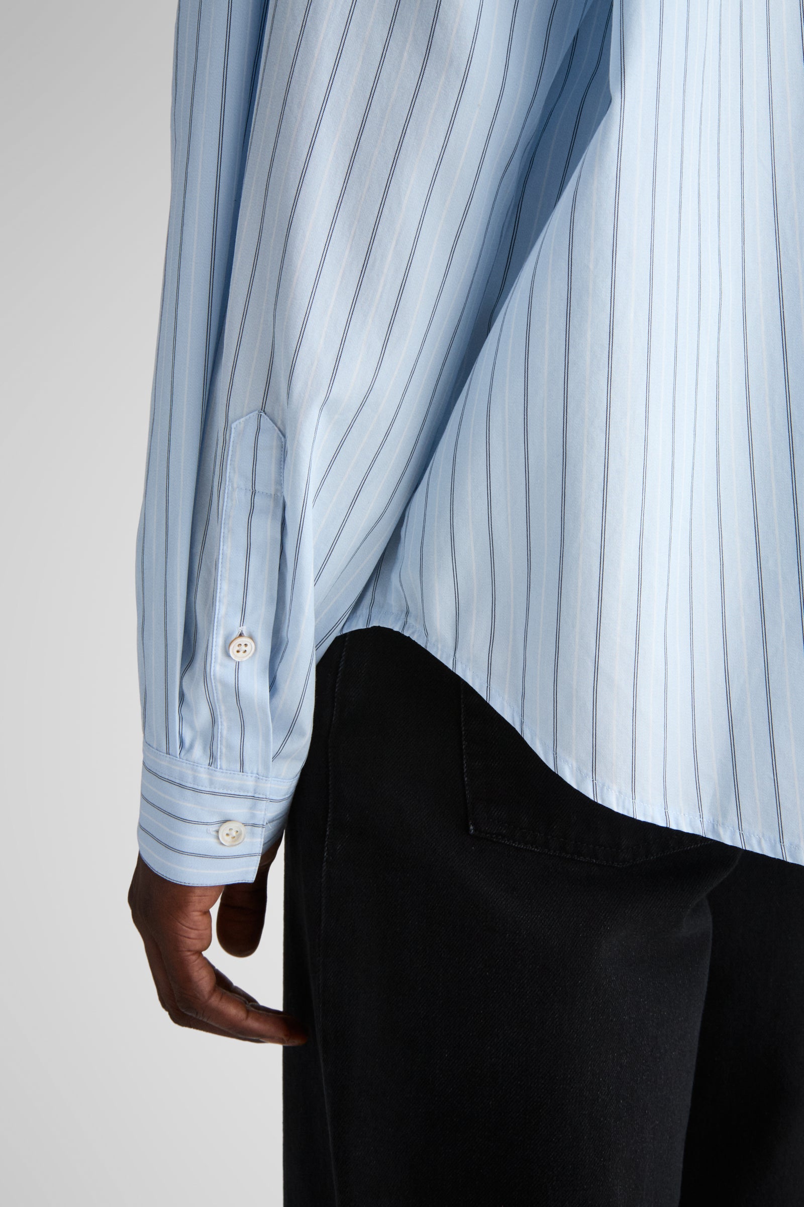 Made in a crisp office stripe poplin designed and developed by Livid, and woven by Somelos in Portugal. This particular poplin has vibrant feel due to the subtle marl of the light blue yarns of the background colour.