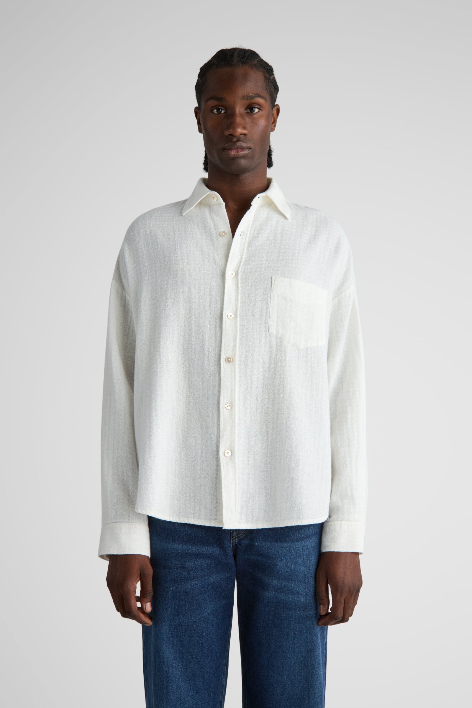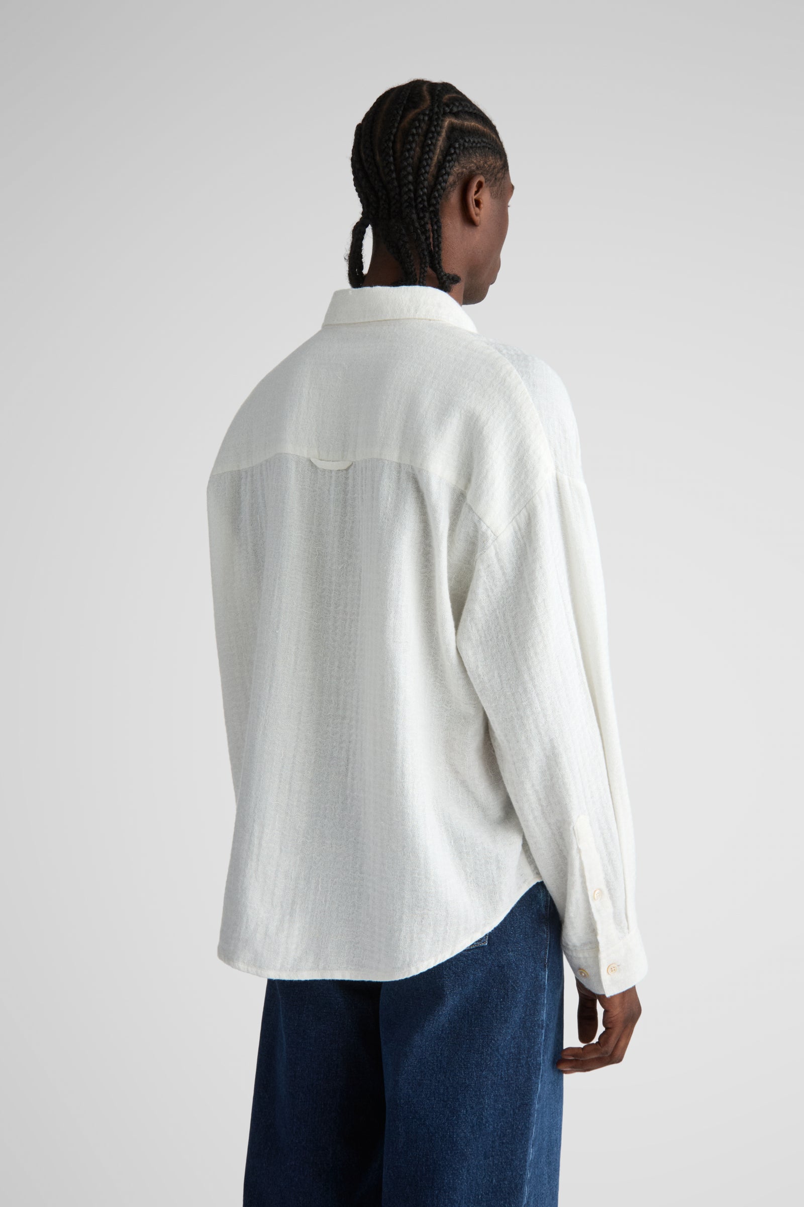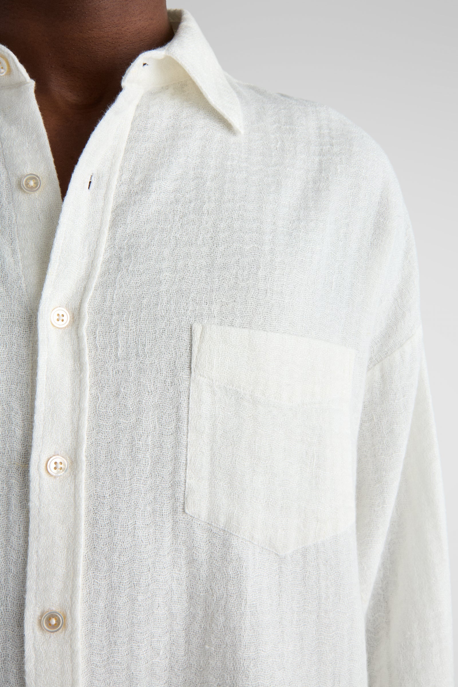 Made in a textured fabric, consisting of a loosely woven cotton fabric with a wobbly weave pattern, bonded to a loosely woven linen fabric. The resulting fabric has an added thickness, while still remaining lightweight. The two loose weaves make the shirt highly breathable, while trapping air and insulating when used as a midlayer.