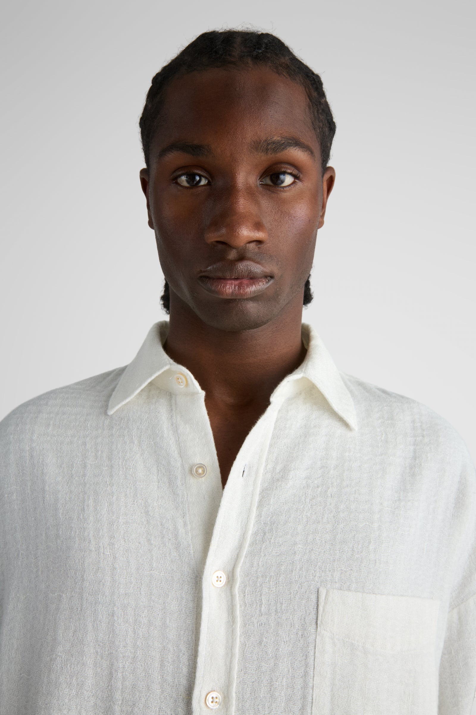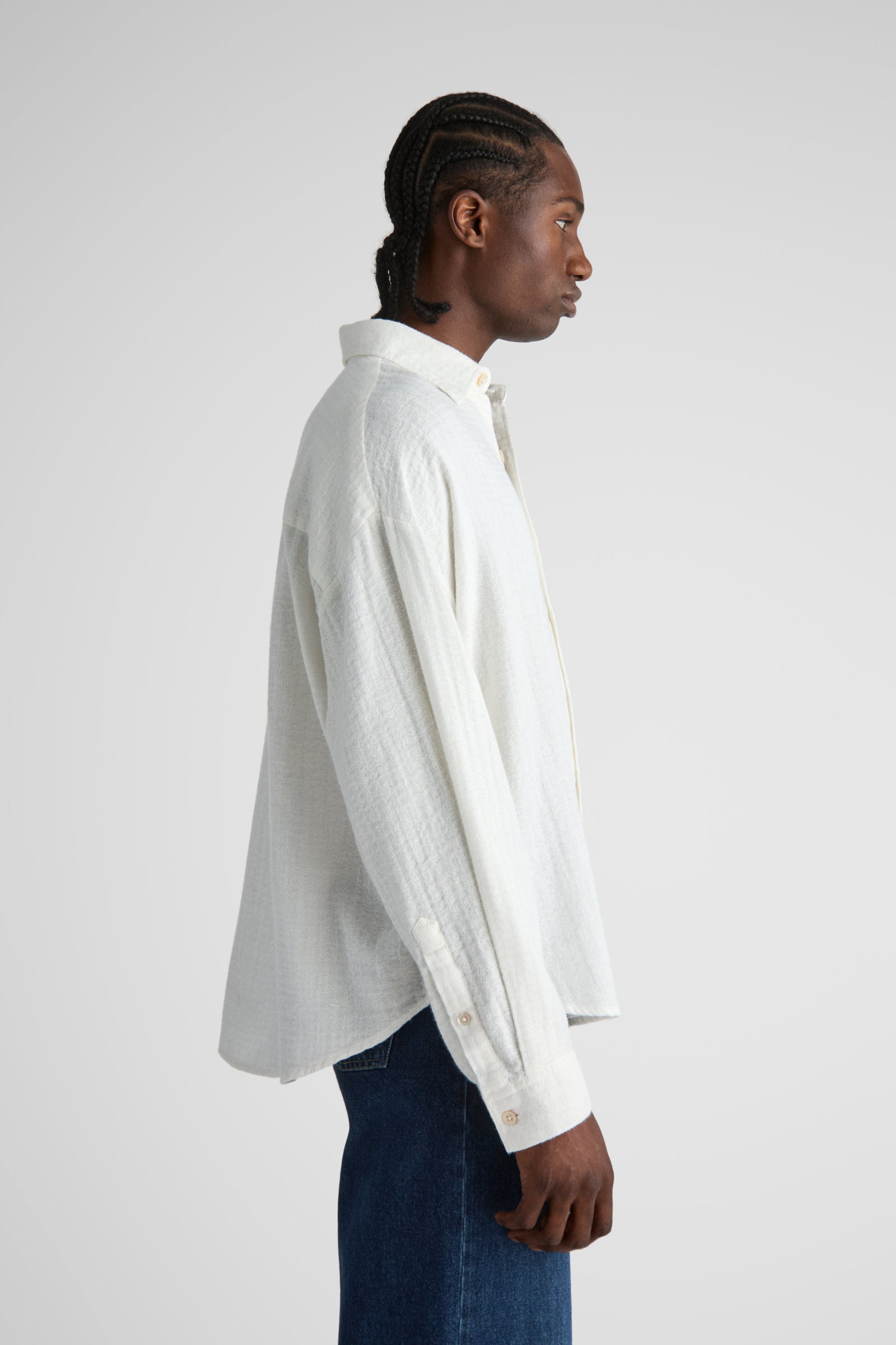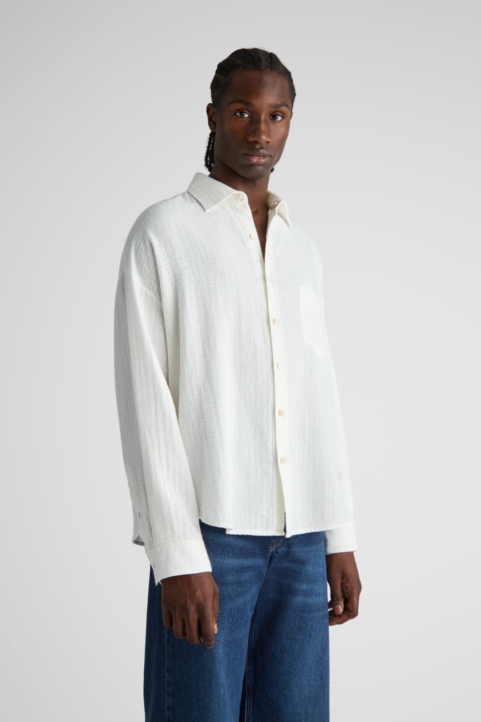 Made in a textured fabric, consisting of a loosely woven cotton fabric with a wobbly weave pattern, bonded to a loosely woven linen fabric. The resulting fabric has an added thickness, while still remaining lightweight. The two loose weaves make the shirt highly breathable, while trapping air and insulating when used as a midlayer.