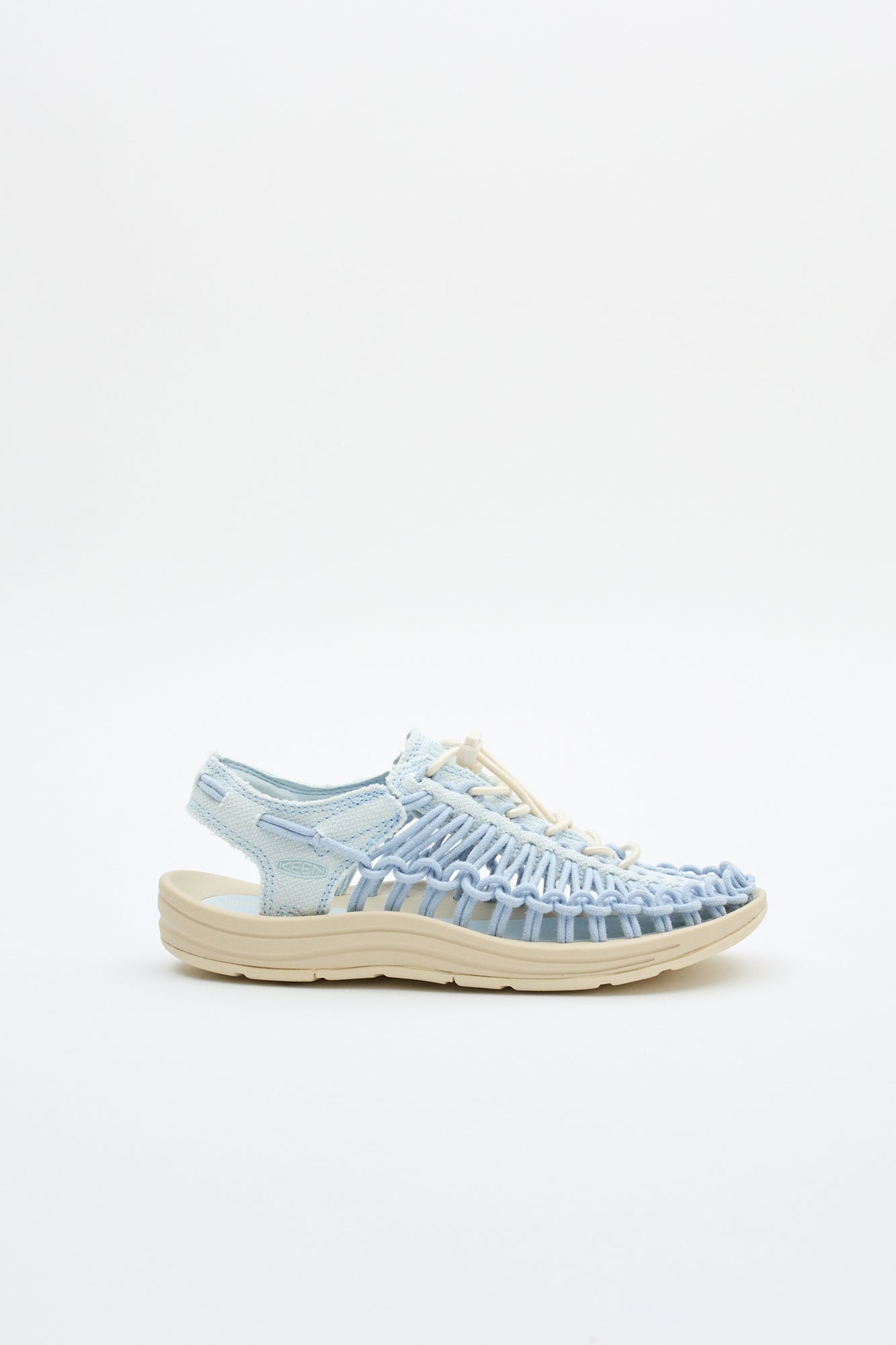 Keen's instantly recognizable Uneek sandal, designed with a two cord upper and a grippy rubber sole, made with canvas detailing on the upper.